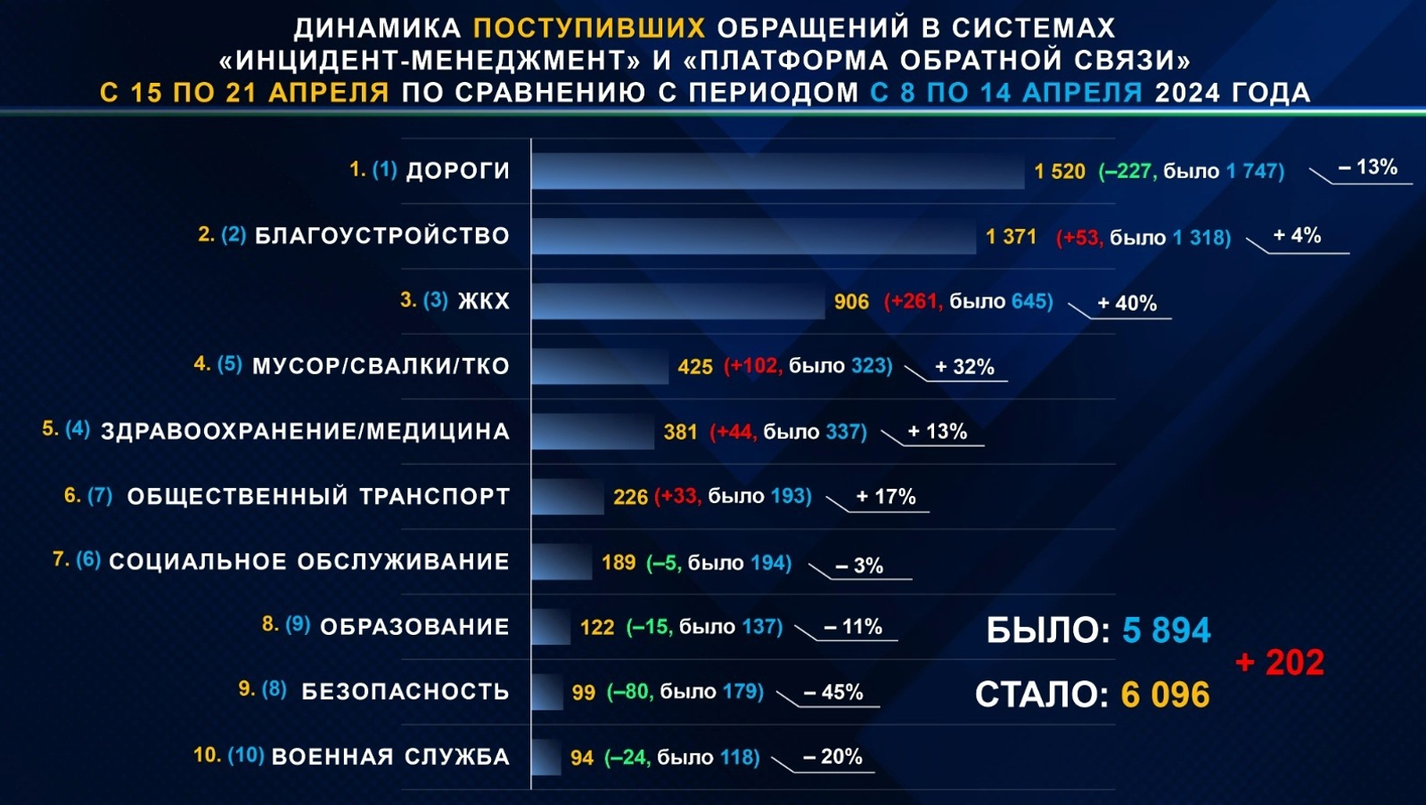 ЦУР Башкирии поделился статистикой обращений жителей республики, которые зафиксировали информсистемы «Инцидент менеджмент» и Платформа обратной связи на минувшей неделе, с 15 по 21 апреля.