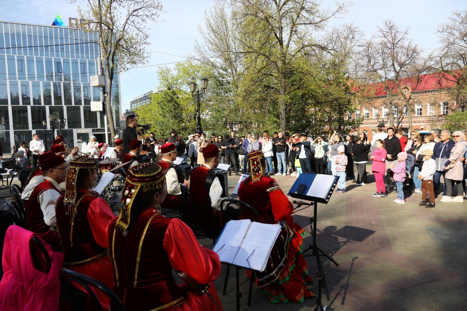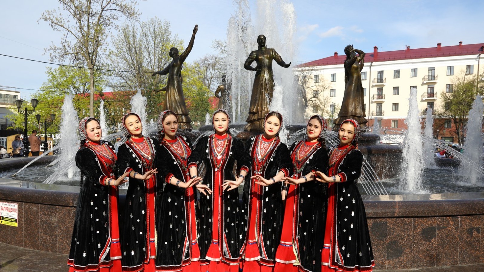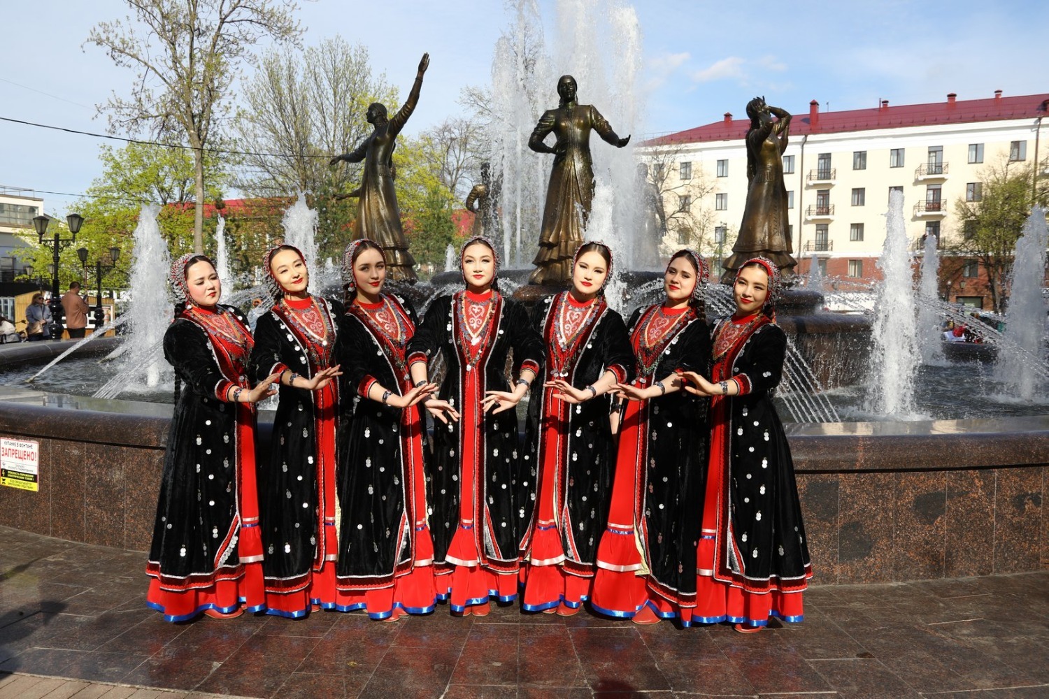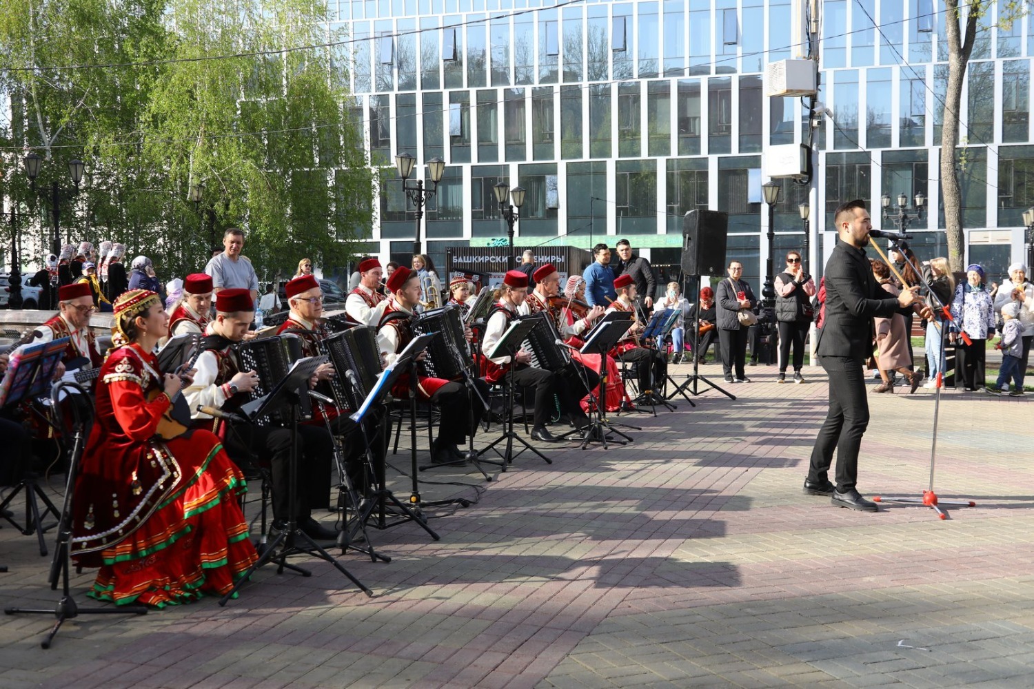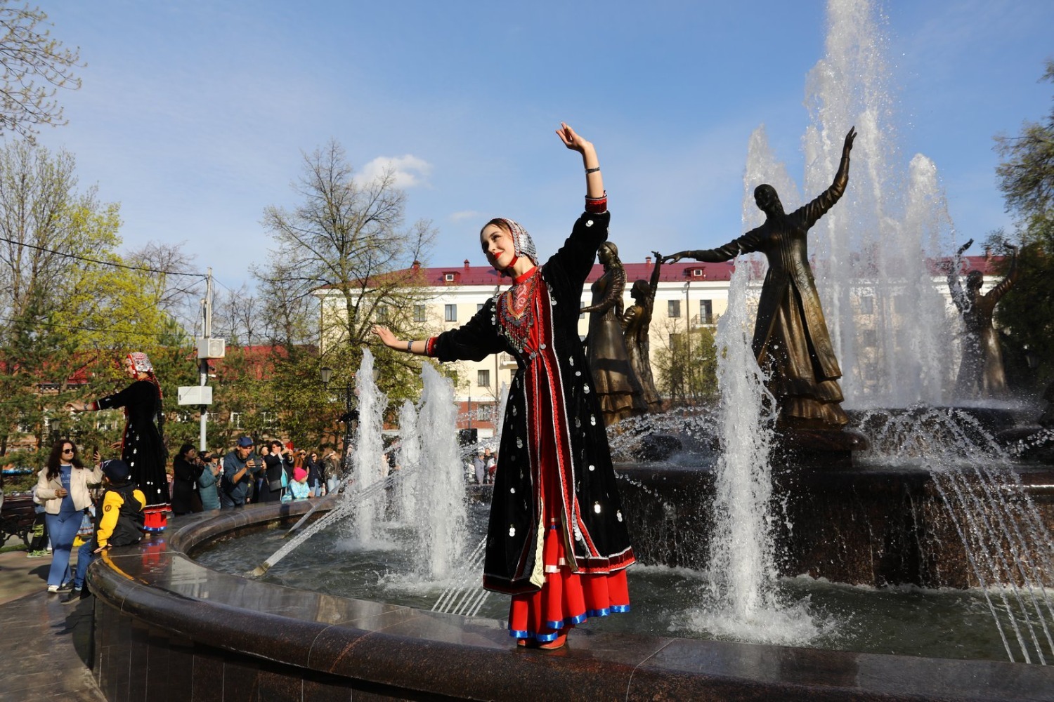 В Театральном сквере горожане с удовольствием наблюдали за ожившими персонажами фонтана. Легендарный танец «Семь девушек» представили артистки ансамбля народного танца «Талария» Торгово-экономического колледжа (руководитель Илюза Нугманова). Своими музыкальными номерами порадовали артисты оркестра народных инструментов ансамбля народного танца и песни «Мирас» Уфы.