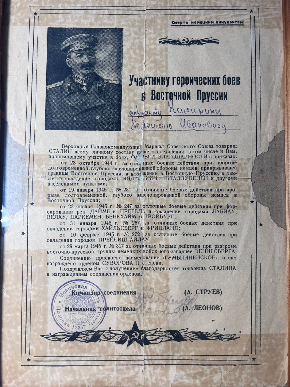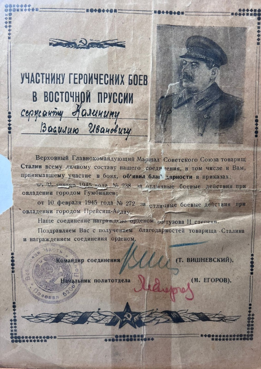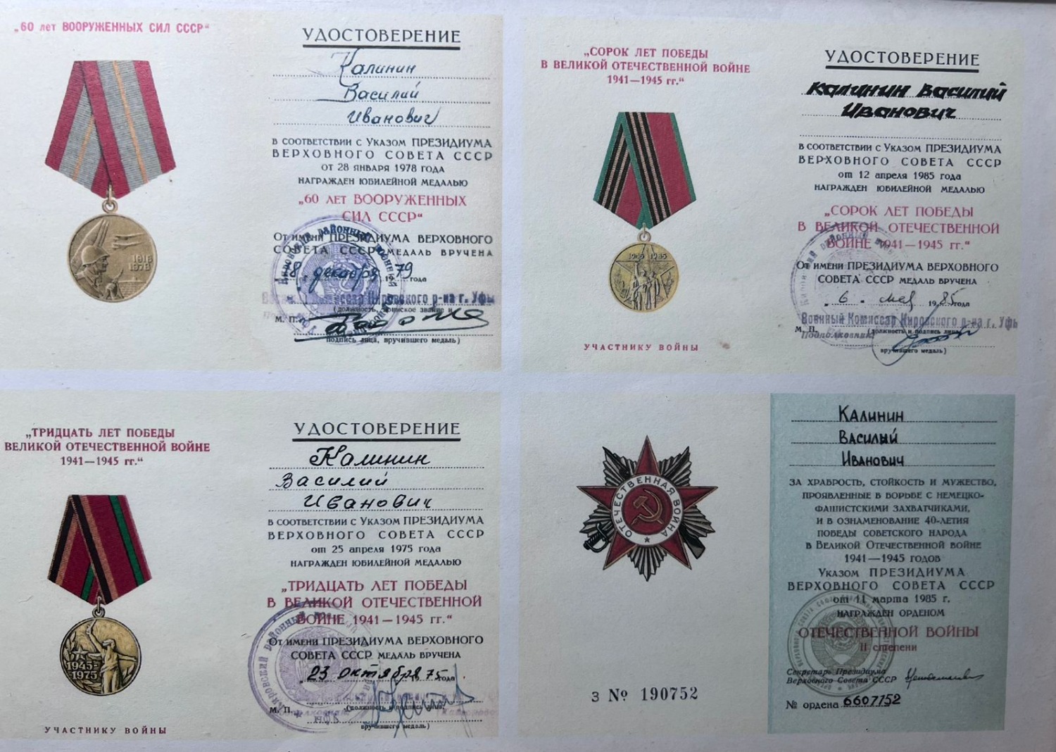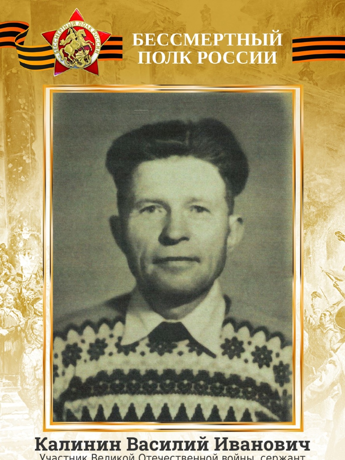 - Мой дедушка – Калинин Василий Иванович, когда началась Великая Отечественная война, отправился на 2-й Белорусский фронт. Он был сержантом, командовал взводом солдат, занимался корректировкой огня батареи. В сражении за Днепр дед переправился на лодке через реку и сообщил координаты местонахождения немцев, за что вместе со взводом был удостоен ордена Красного Знамени. За мужество и героизм, проявленные в боях с фашистскими оккупантами, он был награжден орденом Красной Звезды, еще одним орденом Красного Знамени, также восемью медалями «За отвагу», «За взятие Варшавы» и другие. Победу дедушка встретил в Восточной Пруссии.