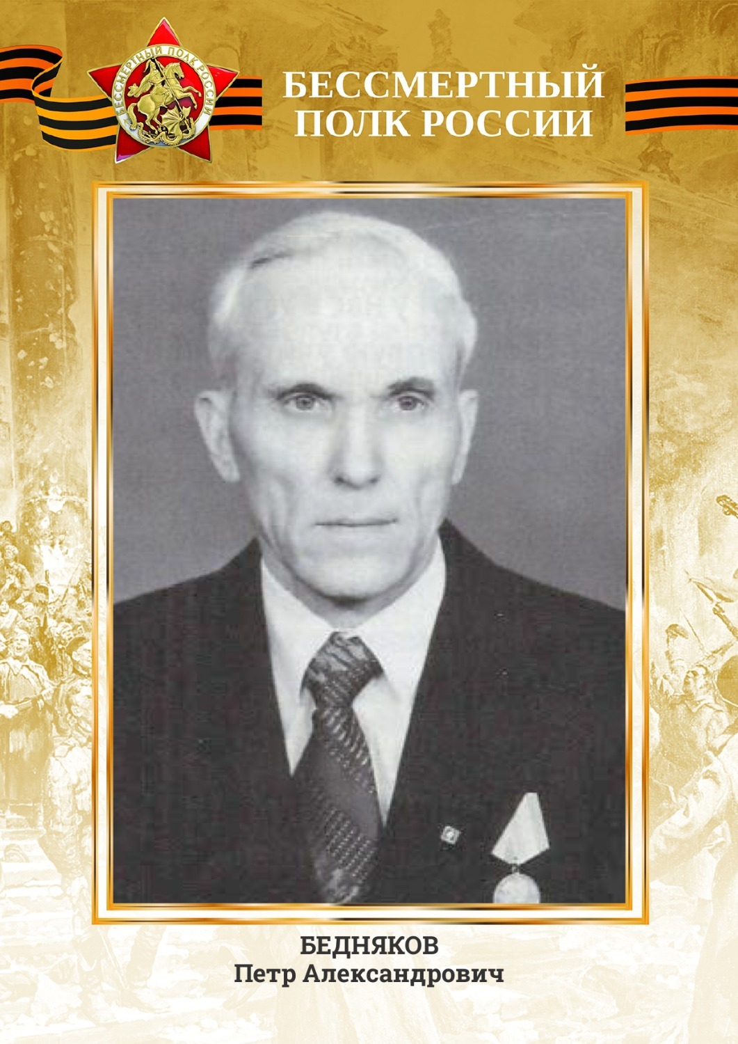 Дедушка по маме, Бедняков Петр Александрович — ребенок войны, родился 25 января 1929 года. Трудился в тылу наравне со взрослыми, в колхозе помогал заготавливать продовольствие. Умер 4 ноября 2020 года.