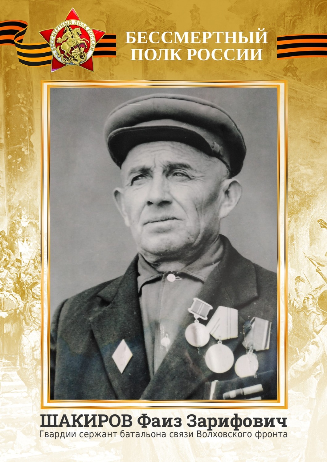 — Мой отец Шакиров Фаиз Зарифович воевал на Волховском фронте с 1942 по апрель 1944 года, был связистом. Прорывал блокаду Ленинграда, был тяжело ранен, контужен, осколок попал в голову, повредил там что-то, одна сторона его тела была парализована, не мог говорить. Полгода его выхаживал сам знаменитый нейрохирург Бурденко. Отец выжил, и после войны у него родились, в дополнение к довоенным нашим брату и сестре, еще четыре сына. После войны учительствовал в сельских школах Зианчуринского района Башкирии. Прожил после Победы еще 47 лет, дожив до 78…