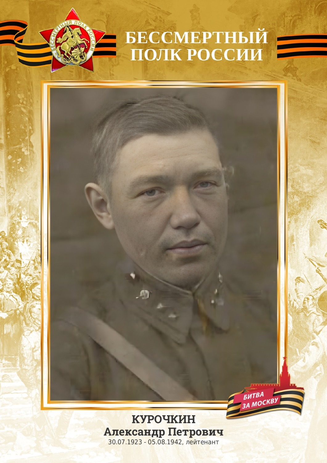 — Мой дедушка, Курочкин Александр Петрович, ушел на фронт вслед за отцом — добровольцем в 17 лет, приписав себе лишние месяцы до 18-летия. По распределению попал в Чебоксарское военное училище. Лейтенантом ступил на поля военных сражений, командовал взводом III пулеметной роты 364-го стрелкового полка 139-й стрелковой дивизии. Погиб 5 августа 1942 года подо Ржевом, в битве за Москву, названной историками самой кровопролитной в мировой истории. Похоронен в Калининской области, в деревне Теленково. Об этом мама Шуры, Пелагея Андреевна, узнала из похоронки. А в 1945-м с фронта вернулся ее муж Курочкин Петр Семенович. С новостями…