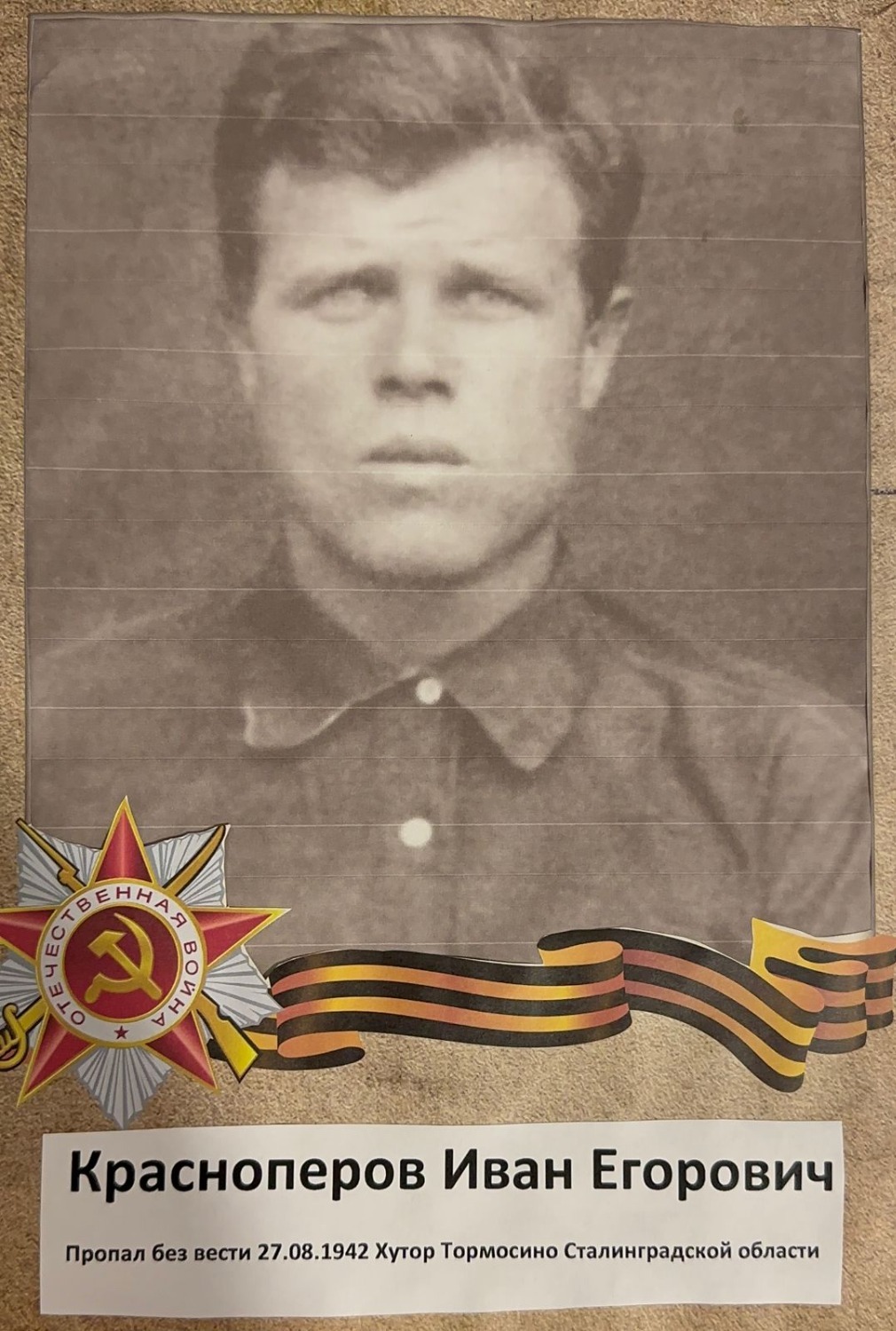 — Оба моих деда — рядовые красноармейцы, погибли на фронтах Великой Отечественной. Красноперов Иван Егорович служил связистом в штабе 214-й стрелковой дивизии. Пропал без вести 27 августа 1942 года во время боев в Иловлинском районе Сталинградской области в возрасте 32 года.