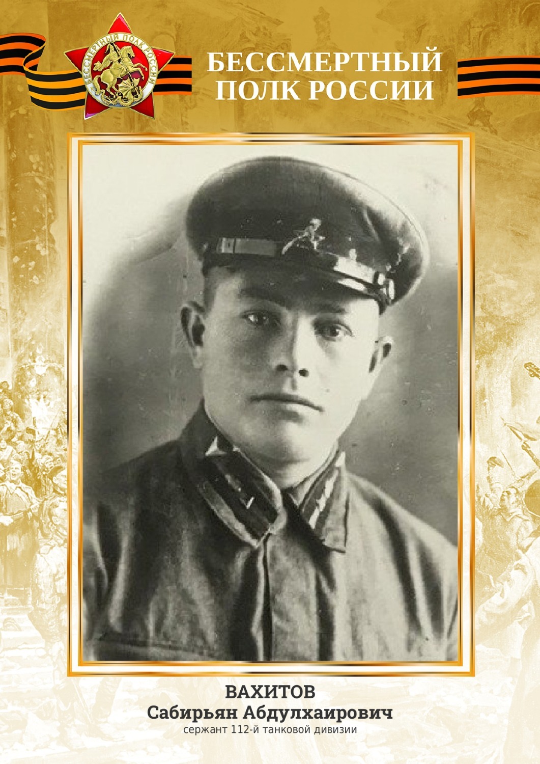 — Мой дед со стороны мамы — Вахитов Сабирьян Абдулхаирович. Родился 15 августа 1919 года, в сентябре 1939 года был призван в Красную армию — 112 танковую дивизию, дислоцированную в городе Николаев Уссурийского края на Дальнем Востоке, служил механиком-водителем легендарного Т-34 в звании старшего сержанта. В 1941 году в связи с приближением врага к Москве 112-я дивизия срочно была переброшена на защиту столицы. В ходе ожесточенных оборонительных сражений Сабирьян Вахитов получил два тяжелых ранения. Рискуя своей жизнью, боевые товарищи моего картатая вытащили его из горящей машины и спасли ему жизнь.