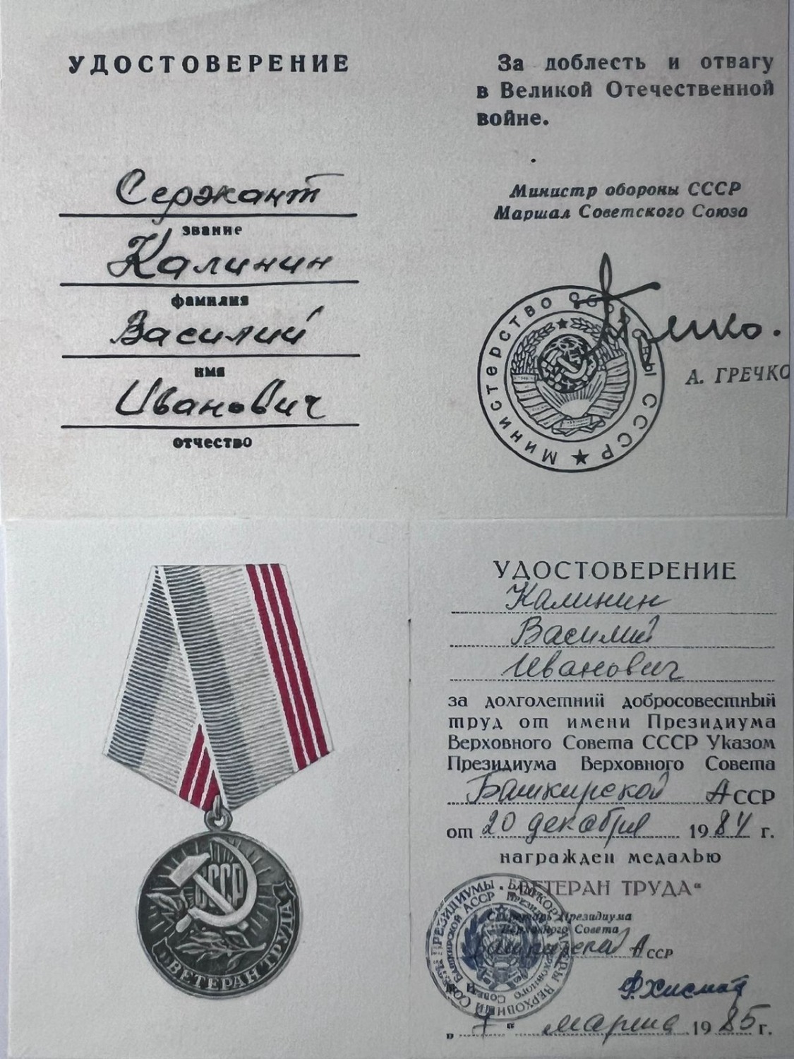 — Мой дед по маминой линии Дементьев Александр Максимович родился в декабре 1919 года в селе Надеждино Белебеевского района Башкирии. В годы Великой Отечественной войны его, как и большинство других советских граждан, мобилизовали. Мой дед служил в пехоте, прошел всю войну. За проявленный героизм в борьбе с фашистами удостоен нескольких медалей и орденов. После окончания Великой Отечественной войны Александр Дементьев в августе–сентябре 1945 года участвовал в советско-японской войне. Вернулся в родную Башкирию в звании сержанта. Умер и похоронен в городе Белебее в 1988 году.