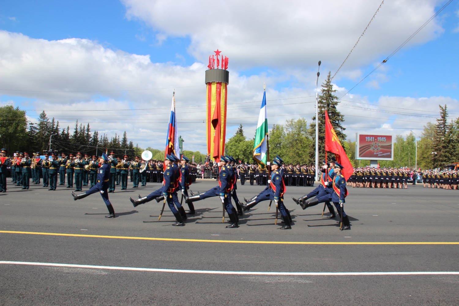 Строевым шагом по площади имени Ленина прошли более 1500 военнослужащих Уфимского гарнизона, сотрудников учреждений силовых структур, расположенных в Уфе, ветеранов боевых действий и военной службы, курсантов и кадетов учебных заведений, кинологической службы МВД и парадный расчет кавалерийского взвода батальона оперативного реагирования Полка патрульно-постовой службы полиции Управления МВД РФ по Уфе. Кадеты школы-интерната с первоначальной лётной подготовкой имени Мусы Гареева, учащиеся «шаймуратовских» классов и кадетских классов морских пехотинцев пронесли развернутые флаги России, Башкортостана, Уфы и Знамя Победы.