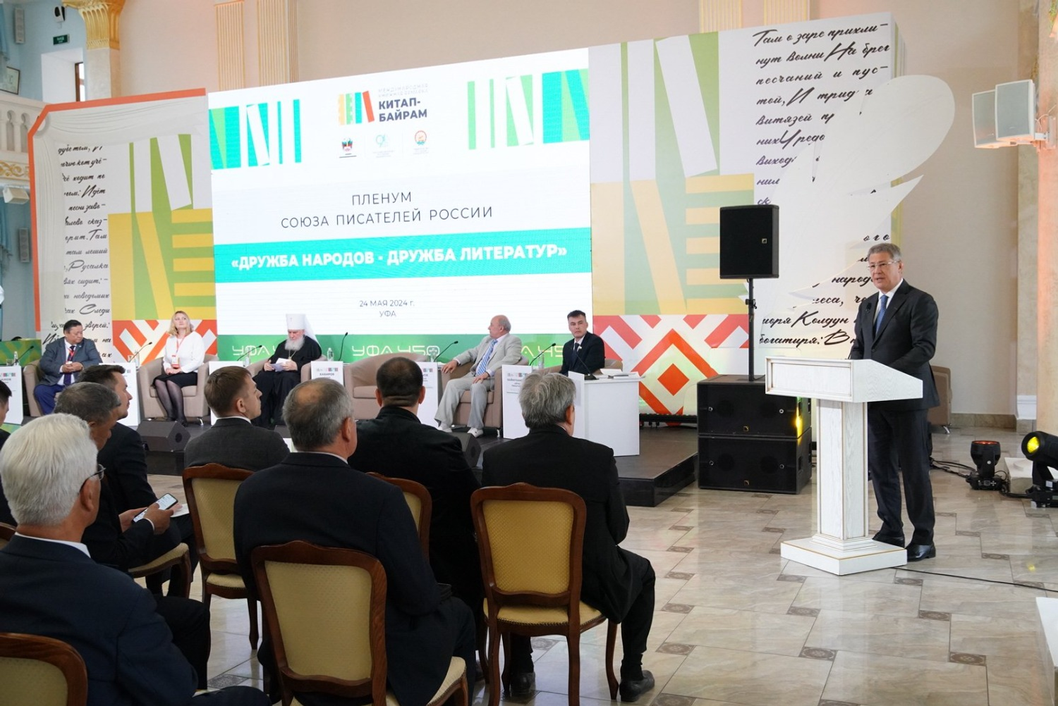 «Наша вторая Международная книжная ярмарка «Китап-байрам» собрала в Уфе писателей из многих российских регионов. В этом году один из старейших творческих союзов Башкортостана – Союз писателей республики отмечает свой 90-летний юбилей. К этой дате наше писательское сообщество подошло с важными успехами и большими планами. От имени всех жителей республики, огромной армии ваших читателей поздравляю с этой знаменательной датой. Вы – наши учителя, друзья, соратники. На ваших книгах выросло не одно поколение настоящих патриотов России, мужественных защитников Отечества, талантливых тружеников. Ваш юбилей – большой праздник для всей республики и страны.