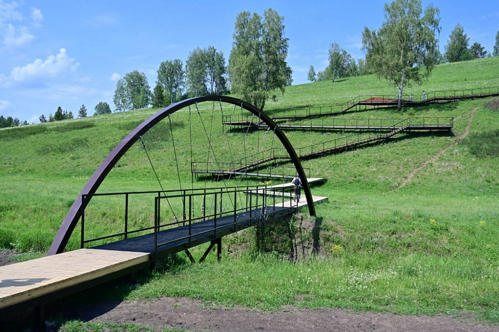 «Салауат Купере». Мост через речушку Усть-Канда в форме радуги из полупрозрачной металлической сетки. Под мостом установлено мельничное колесо.