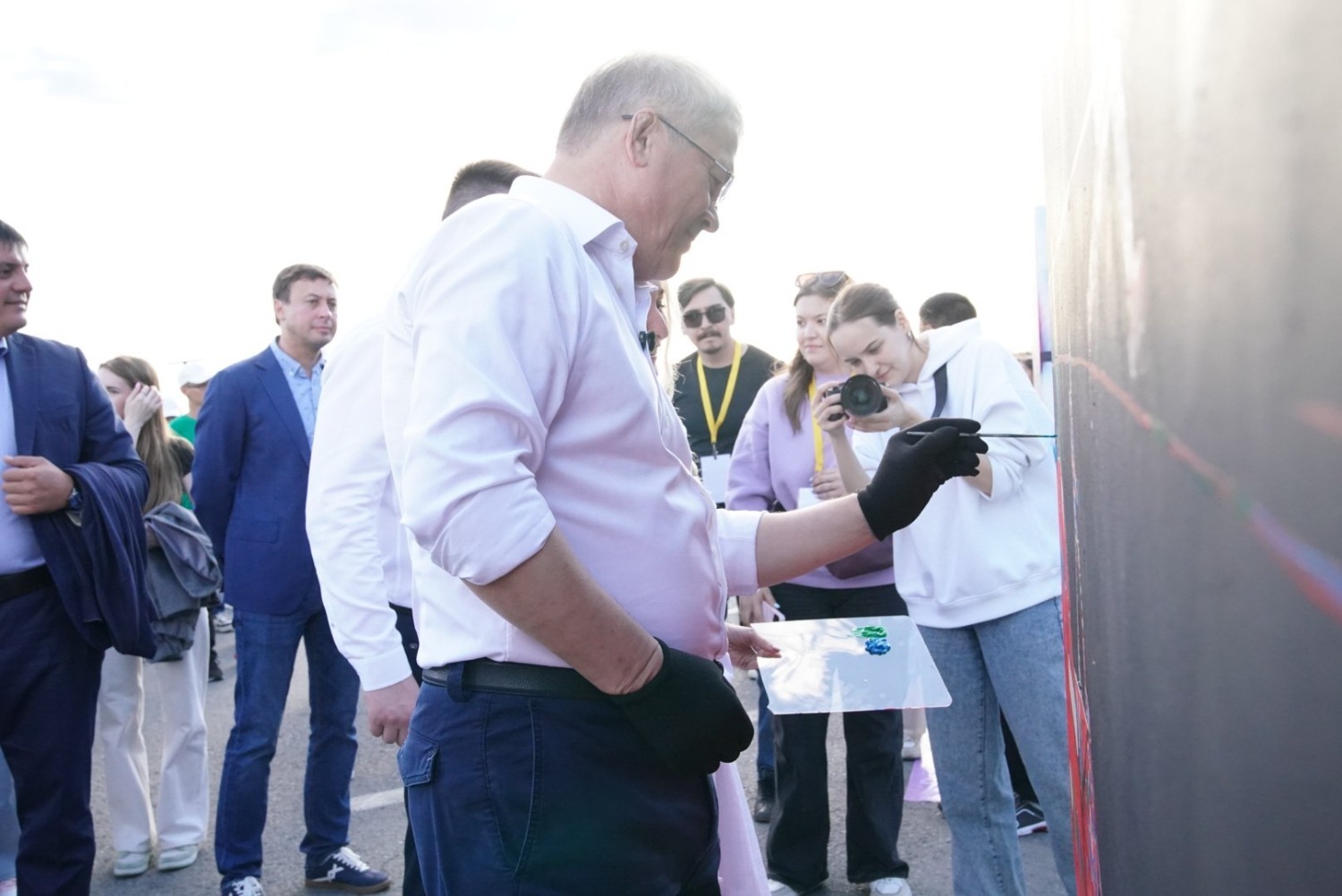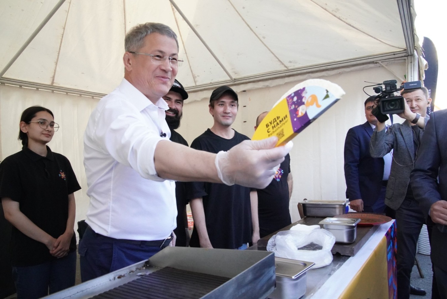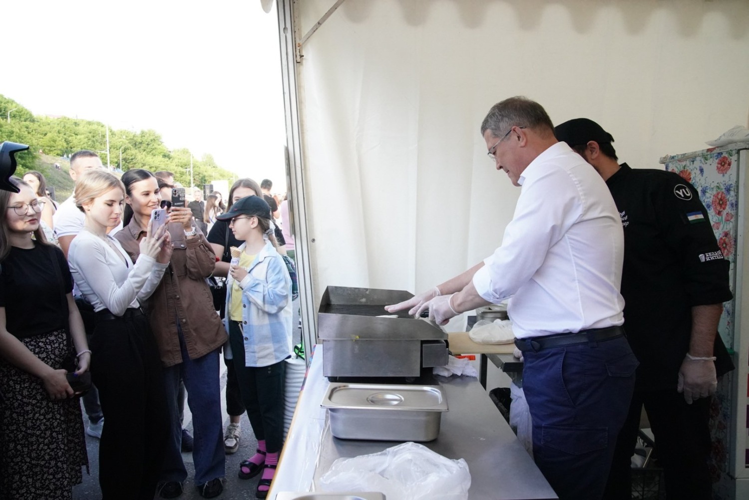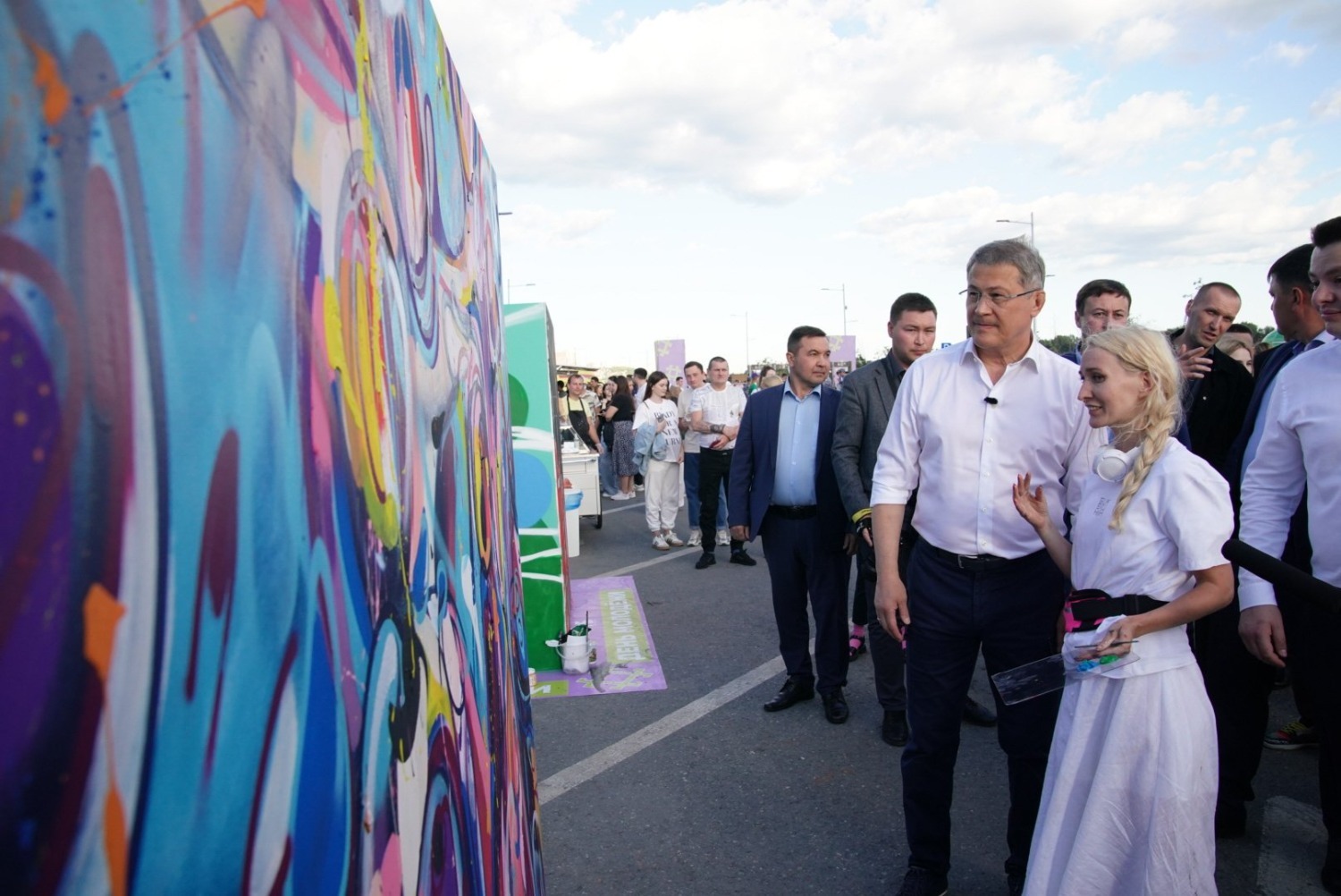 Руководитель республики посетил ряд тематических площадок молодежного мероприятия. В частности, Радий Хабиров постоял за диджейским пультом, принял участие в написании граффити картины и мастер-классе по приготовлению национального блюда – кыстыбый. Приготовленный Главой региона кыстыбый достался выпускнице республиканской полилингвальной многопрофильной гимназии №1 Анне Осадовой.
