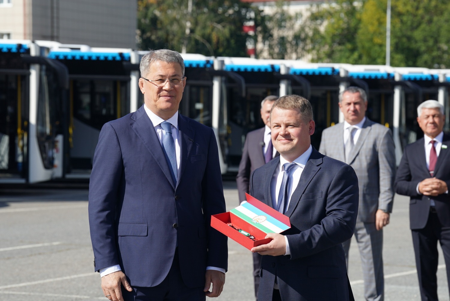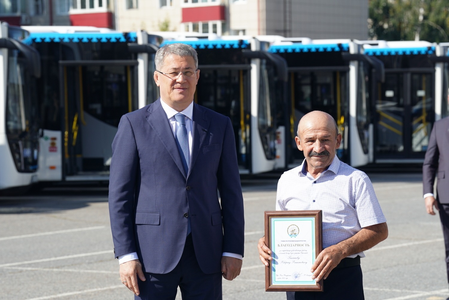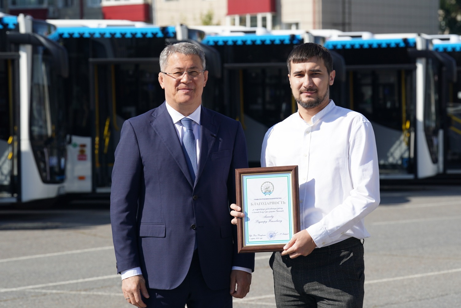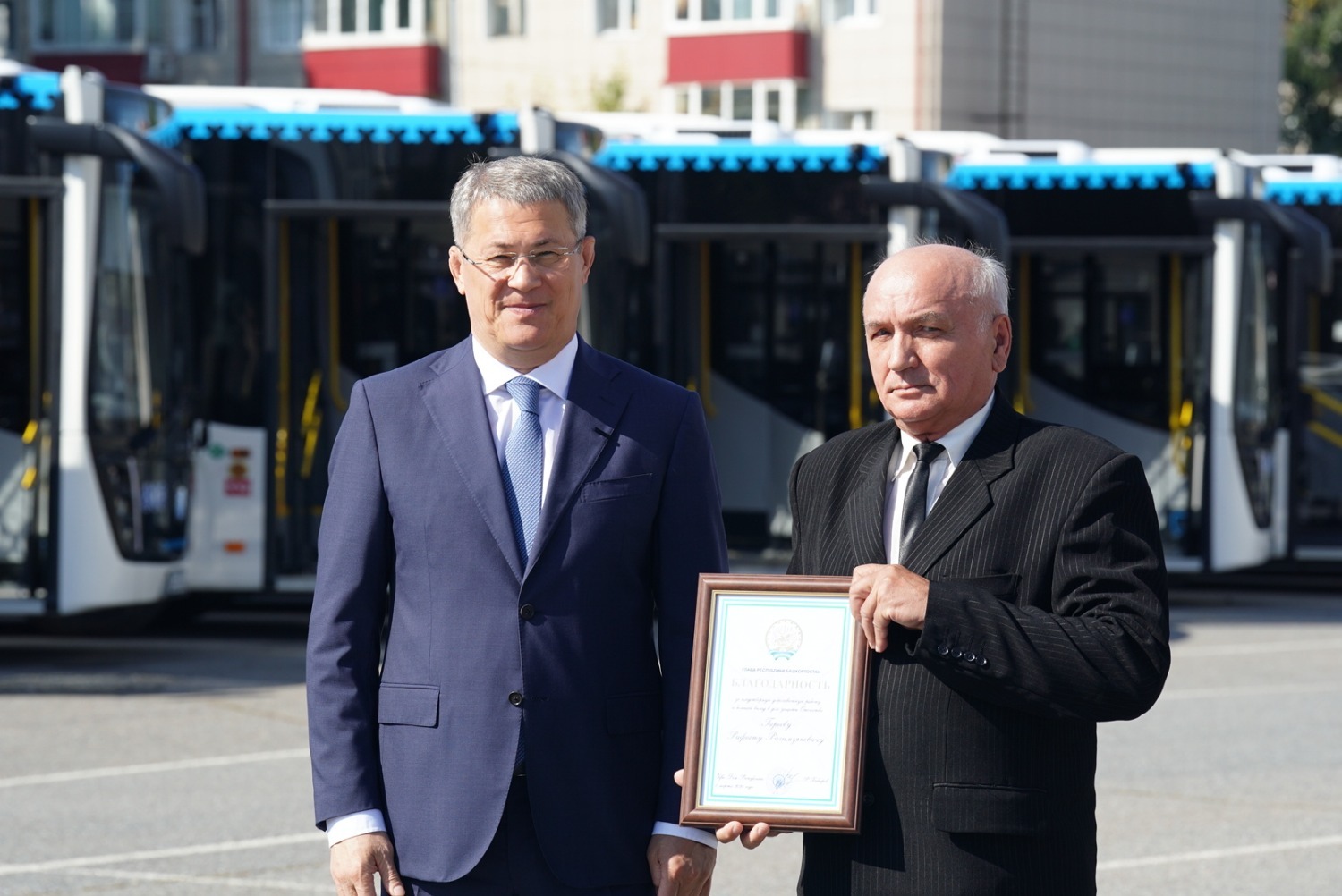 «Мы 31 августа отметим торжественно юбилей Уфы, делаем для столицы такой большой, на мой взгляд, очень важный и долгожданный подарок. Мы передаём нашему „Башавтотрансу“ — главному башкирскому перевозчику — 88 новых больших автобусов, они изготовлены у нас. Мы продолжаем работу по улучшению транспортной инфраструктуры нашей республики, нашей Уфы. И, конечно, в этот день я хочу поблагодарить наш коллектив „Башавтотранса“, вас, уважаемые водители, за ваш труд, он очень серьёзный, очень важный. Мы недавно с генеральным директором „Башавтотранса“ обсуждали перспективы развития предприятия. Я поставил задачу директору: самое главное – забота о людях, потому что несколько тысяч человек работает в „Башавтотрансе“, и вы, собственно, главное наше богатство. Хочу пожелать вам безаварийной работы, добрых и отзывчивых пассажиров, поэтому поздравляю вас ещё раз с этим радостным событием», — сказал Радий Хабиров.