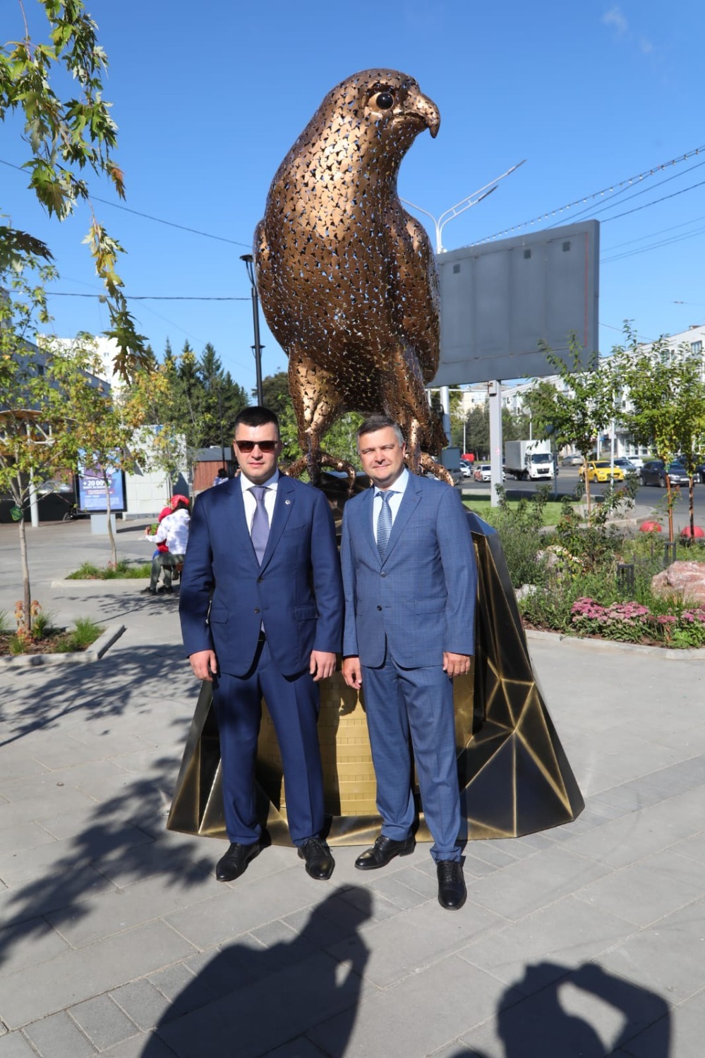 В Уфе около Центрального рынка появился новый арт-объект. Скульптуру на аллее «Центральная» установили в честь соколов-сапсанов, которые гнездятся на крыше высотного здания банка. Металлическая фигура – подарок городу от финансового учреждения. Церемония открытия состоялась сегодня, 29 августа. В ней приняли участие мэр Уфы Ратмир Мавлиев и представители банка. Высота композиции - 3,3 метра, собрана из множества металических деталей, каждая из которых повторяет контур карты Башкортостана.