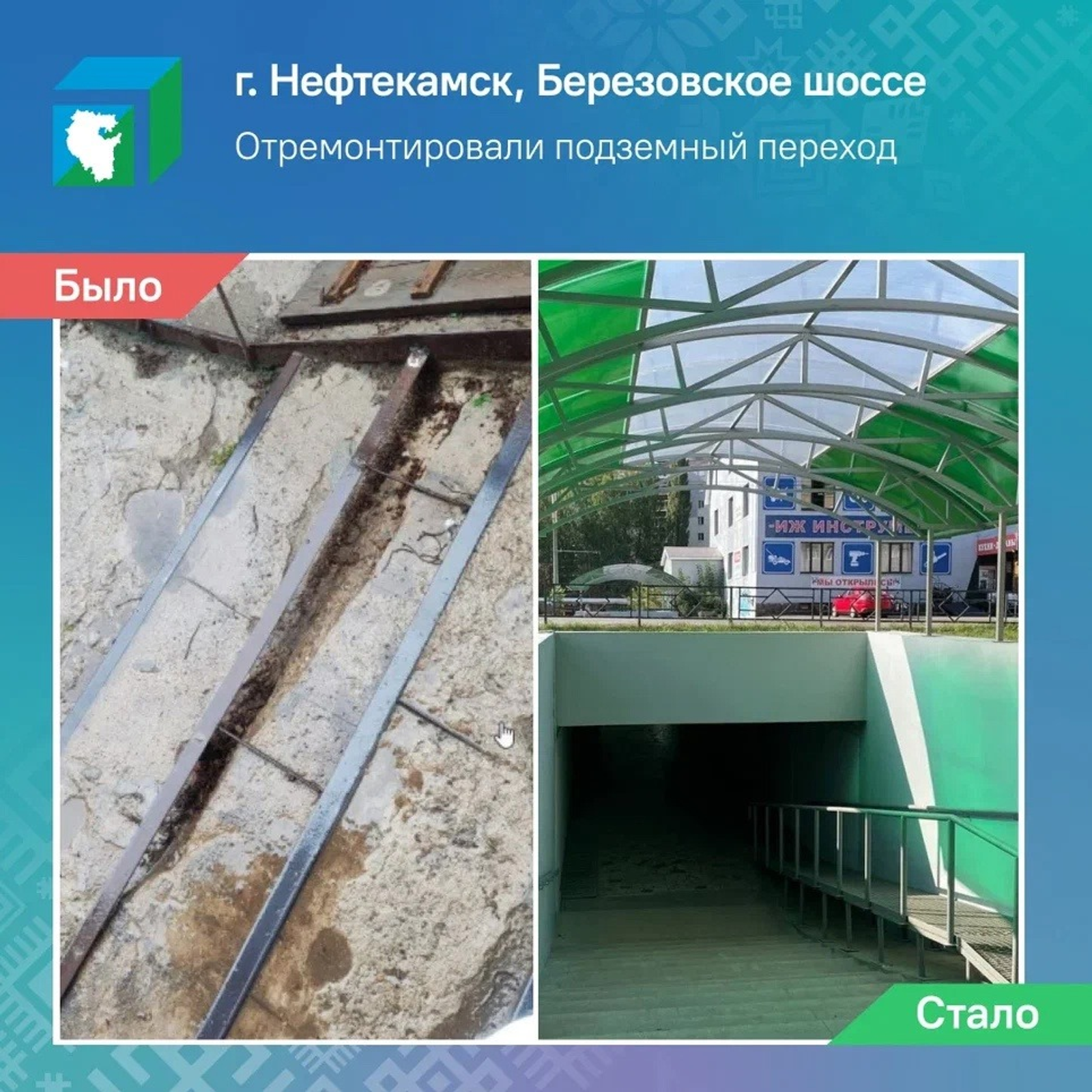 «На время ремонта горожанам предложили временно воспользоваться соседним наземным переходом. 18 сентября глава Нефтекамска Эльдар Валидов сообщил о завершении ремонта. После реконструкции переход заметно преобразился — здесь обновили ступени и перила, покрасили стены и потолок, установили новый пандус и навесы над спусками», — прокомментировали в ЦУРе.