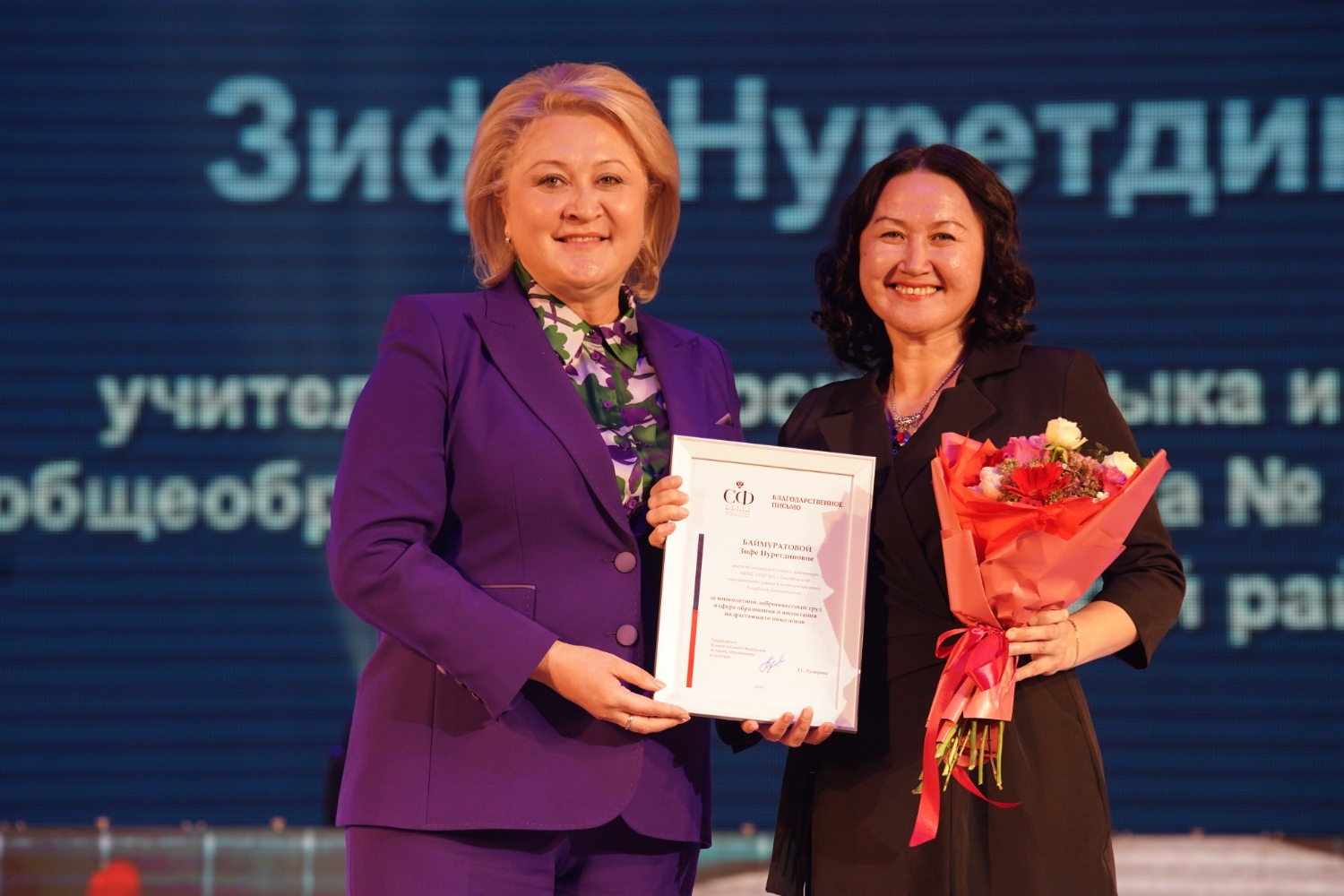 Почетные грамоты РБ вручили воспитателю детсада № 1 «Улыбка» Благовещенска Ирине Супрун и учителю начальных классов школы № 2 в Межгорье Зульфие Фахретдиновой.