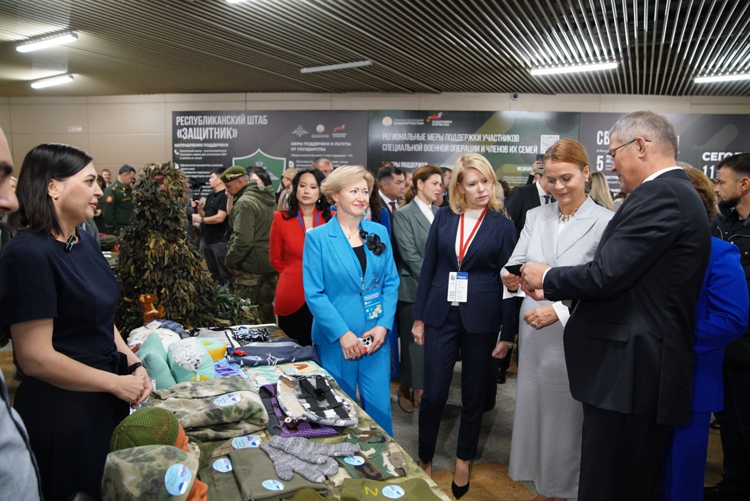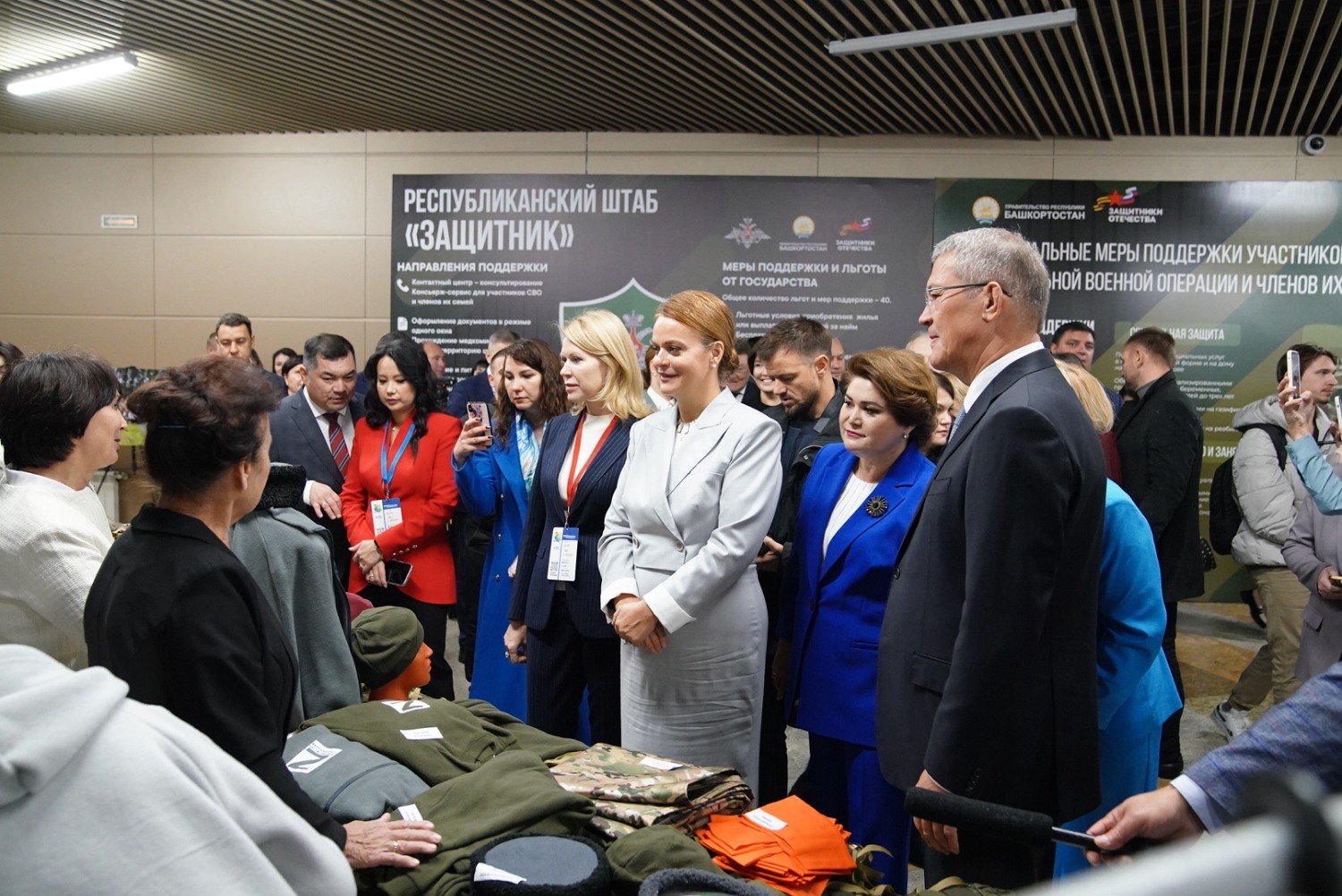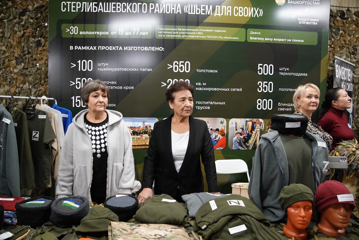 В уфимском конгресс-холле «Торатау» перед началом пленарного заседания третьего Всероссийского форума «Ломая барьеры» Глава Башкортостана Радий Хабиров, статс-секретарь — заместитель министра обороны России, председатель Государственного фонда «Защитники Отечества» Анна Цивилёва и генеральный директор Агентства стратегических инициатив Светлана Чупшева осмотрели выставку, на которой свои изделия представили волонтерские организации «Надежный тыл Башкортостана» и «Шьем и вяжем для Наших Башкортостан». Представители волонтерских движений из Стерлибашевского, Кармаскалинского и Иглинского районов рассказали гостям республики, что они продолжают отправлять посильную гуманитарную помощь нашим бойцам, находящимся в зоне СВО.