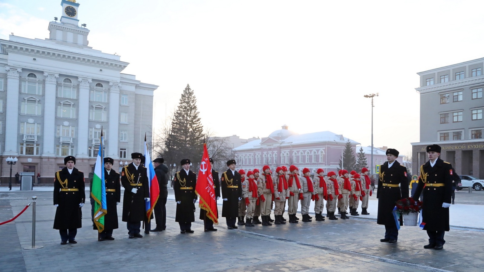 Сегодня в Уфе в честь Дня Героев Отечества состоялись памятные церемонии. В парке Победы от имени многонационального народа Башкортостана члены правительства, общественники, кадеты и юнармейцы возложили венок к памятнику, посвящённому подвигу Героев Советского Союза Александра Матросова и Миннигали Губайдуллина, у подножия которого горит Вечный огонь. На Советской площади церемония прошла у мемориала Героя России генерал-майора Минигали Шаймуратова.