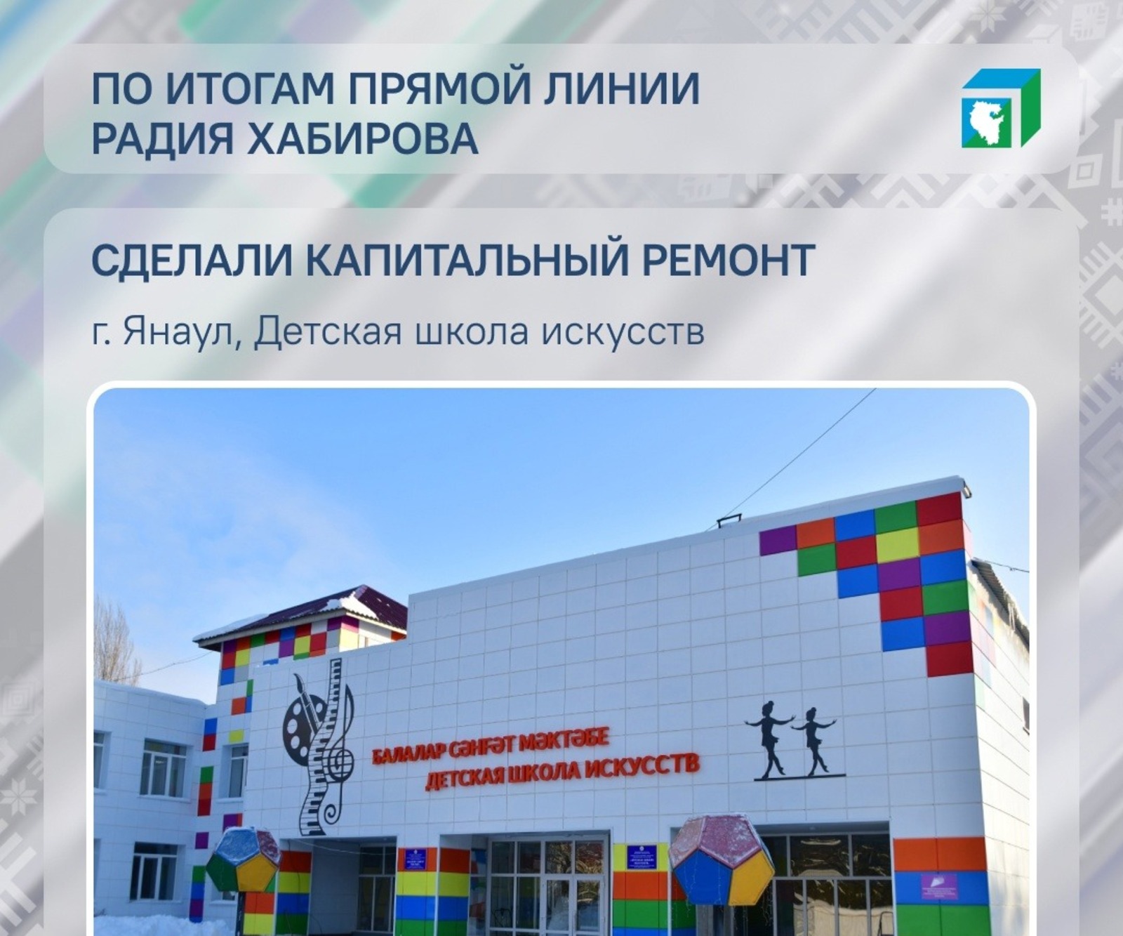 Детскую школу искусств в Янауле отремонтировали после обращения преподавательницы Гузелии Кашаповой на Прямую линию к Главе Башкирии Радию Хабирову в 2023 году. Об этом рассказали в Центре управления республикой.