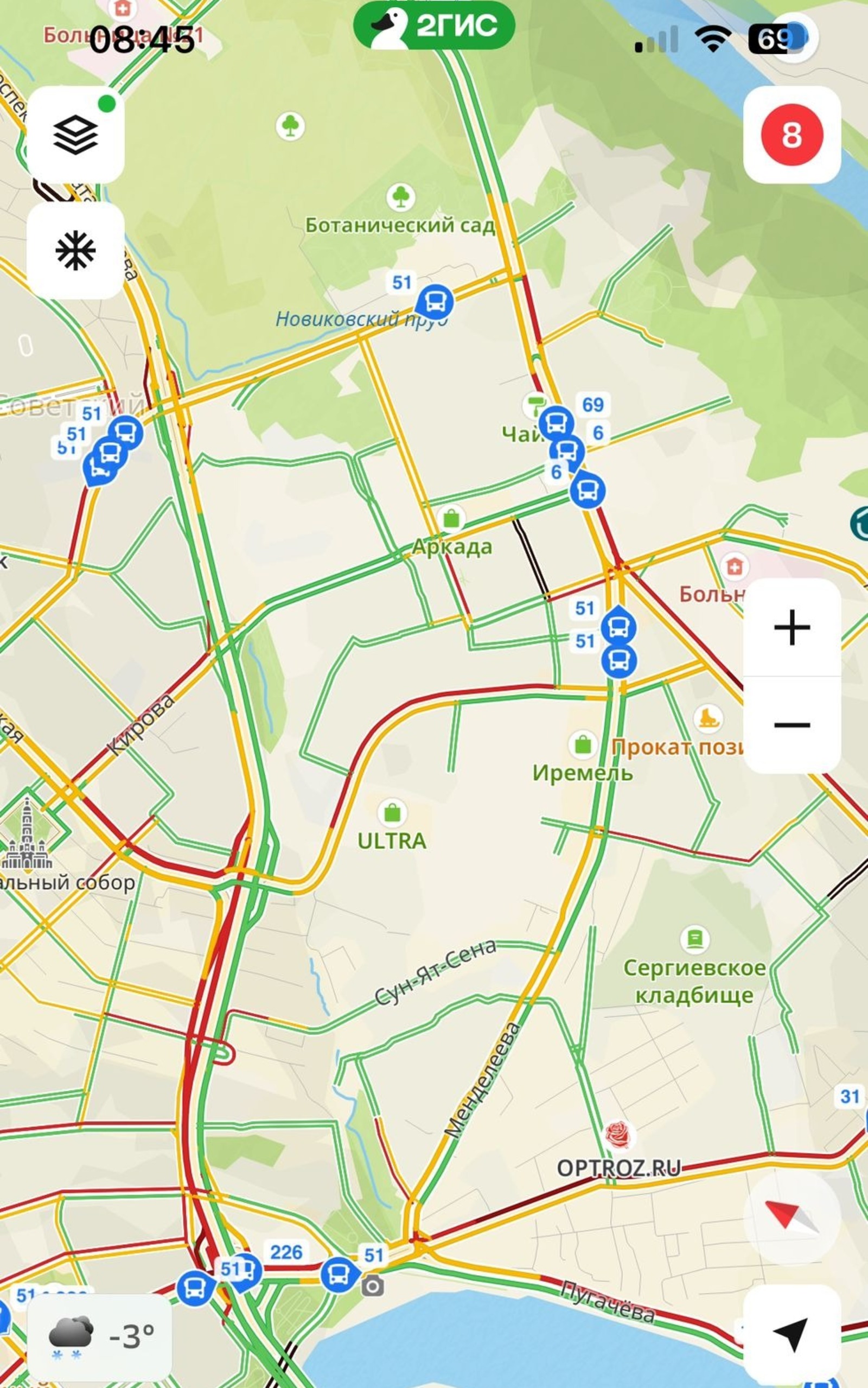 8-балльные пробки сковали дороги Уфы в понедельник, 20 января, в утренний час пик. По данным 2ГИС, серьезные затруднения наблюдаются при въезде в город со стороны Оренбургского тракта, улицы Пугачева, Затонского шоссе.