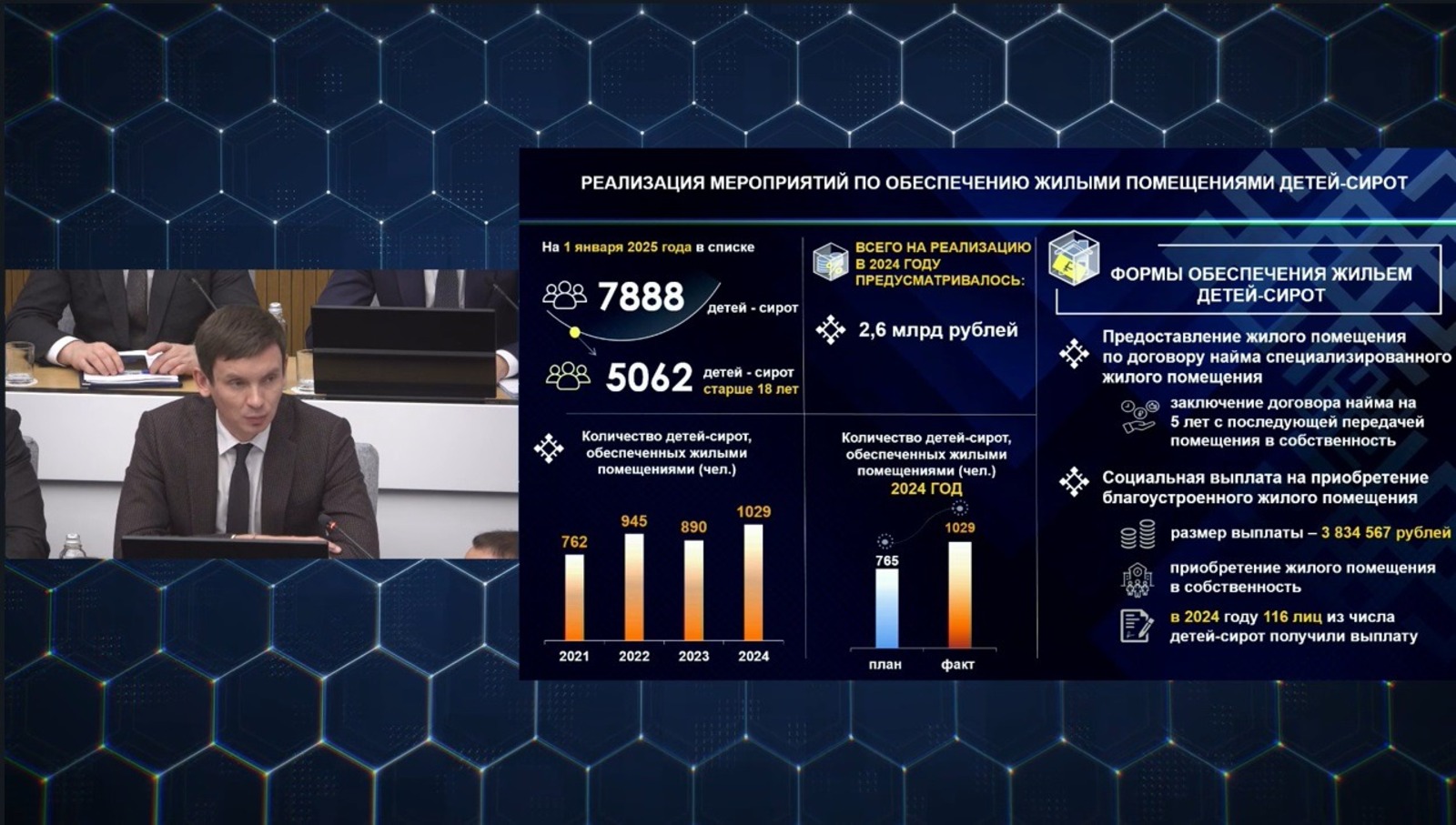 — Всего за 6 лет реализации программы по обеспечению жилыми помещениями детей-сирот 5062 граждан получили жилье. На мероприятия программы в 2024 году было выделено 2,6 млрд рублей. По итогам года 1029 детей получили сертификаты. Максимальный размер выплат составил 3,8 млн рублей. Кроме выданных сертификатов, администрациями районов и городов республики было приобретено 888 жилых помещений для детей-сирот, — сказал Артём Ковшов.