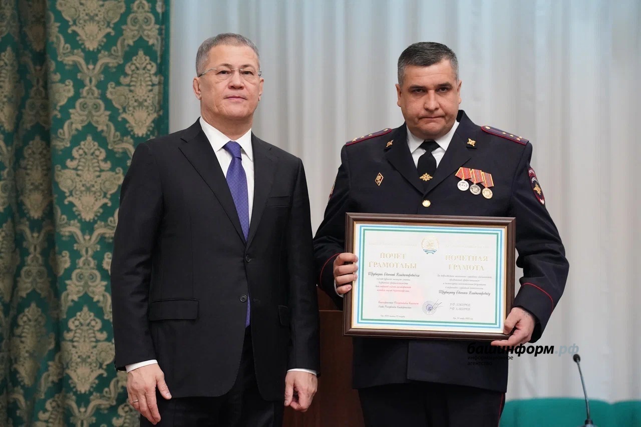 В своем выступлении Михаил Литвинов положительно оценил работу МВД по Республике Башкортостан и взаимодействие ОВД с региональными органами и УФСБ России по РБ. Он вручил отличившимся сотрудникам заслуженные награды. Указом Президента России медалью «За отличие в охране общественного порядка» отмечен заместитель начальника отдела управления уголовного розыска МВД по Республике Башкортостан подполковник полиции Дмитрий Гуляев. Приказом МВД России медалью «За доблесть в службе» награжден старший инспектор Управления по вопросам миграции МВД по РБ капитан полиции Вадим Зиганшин.