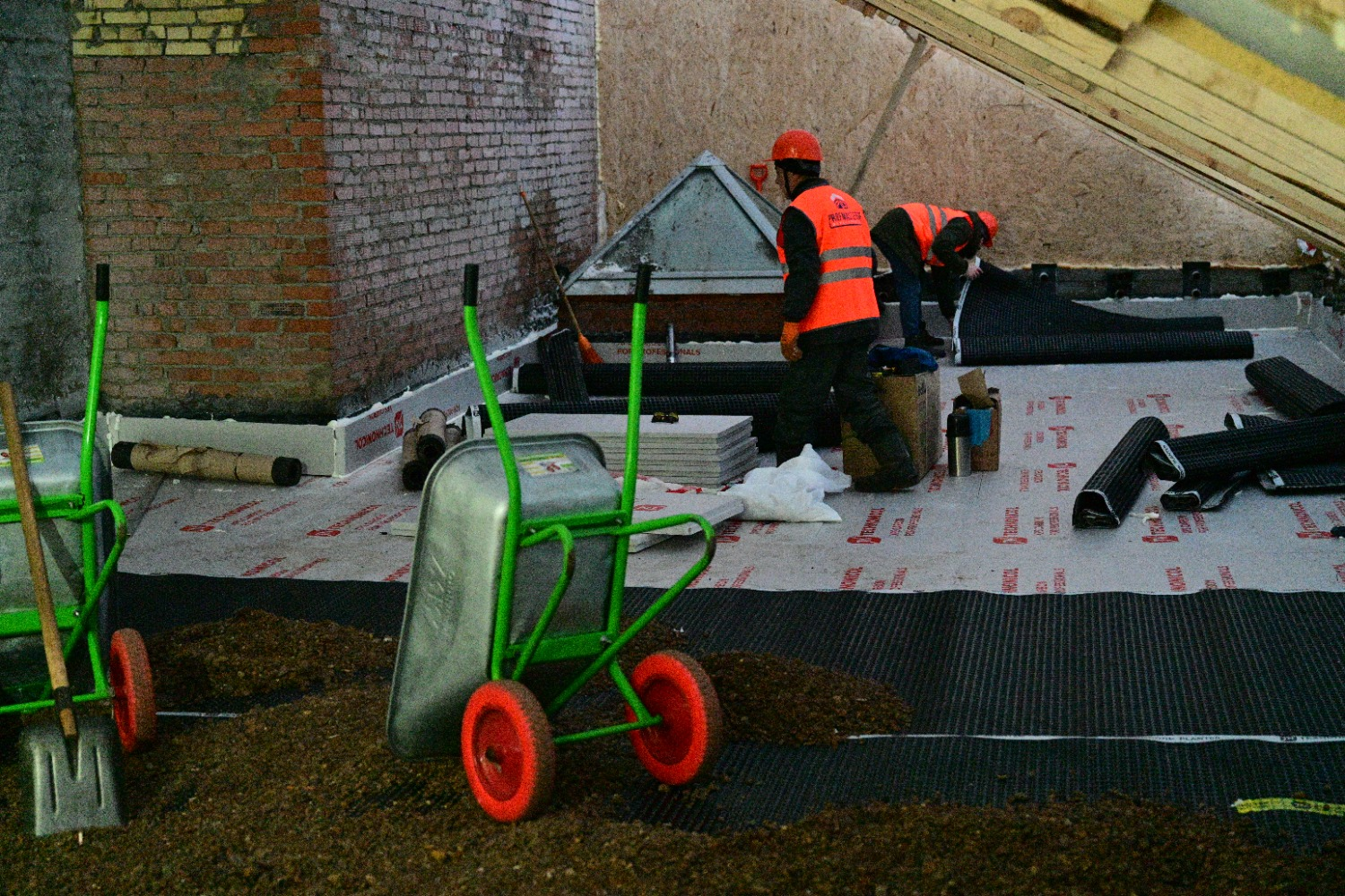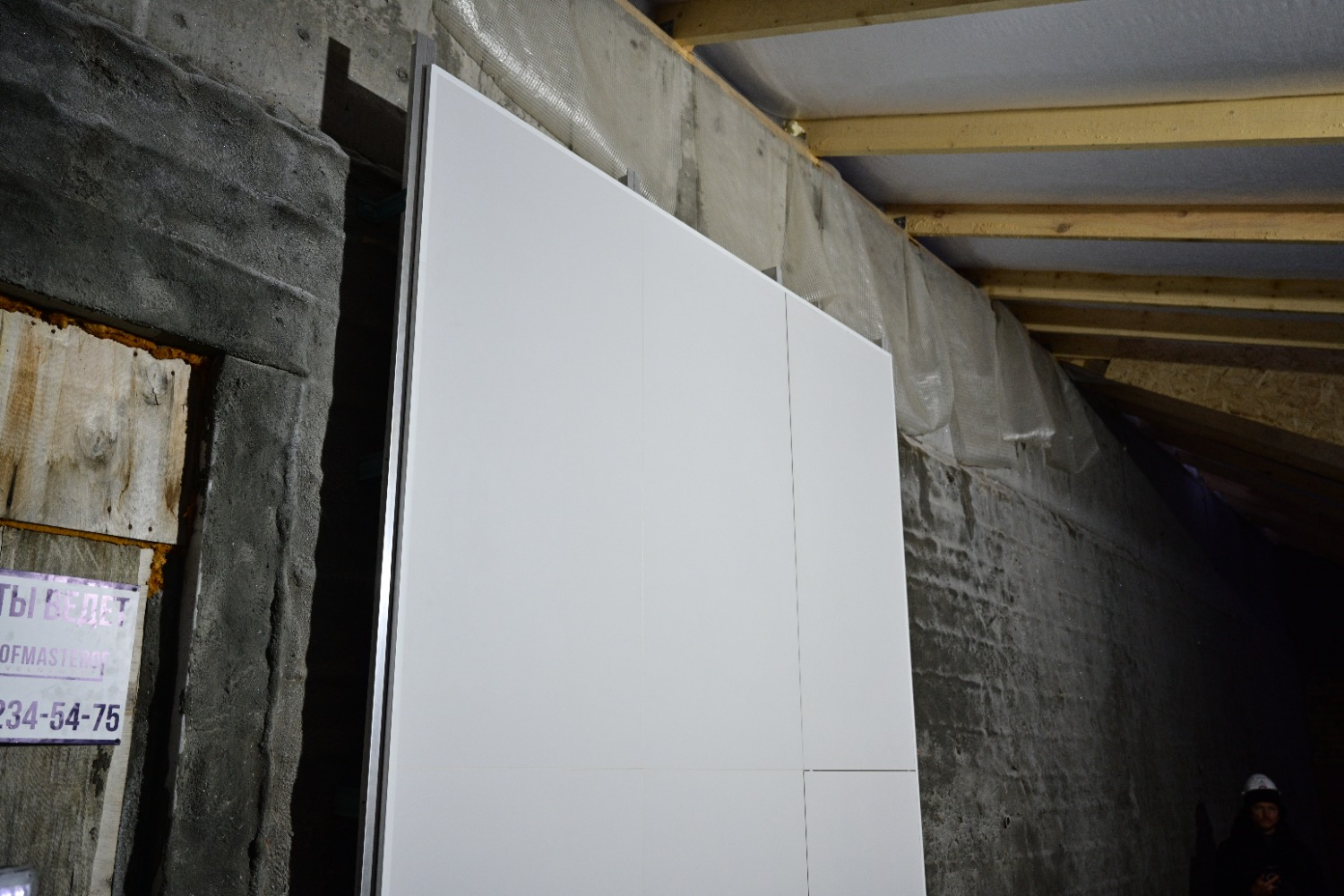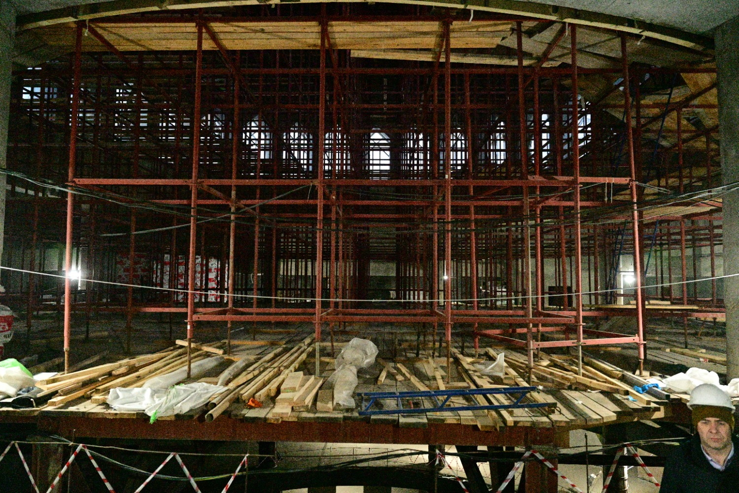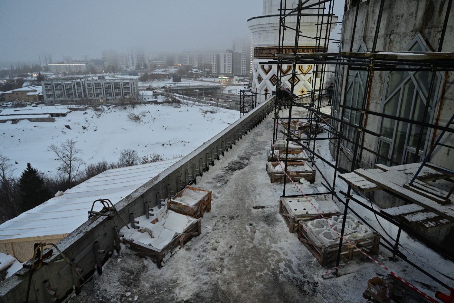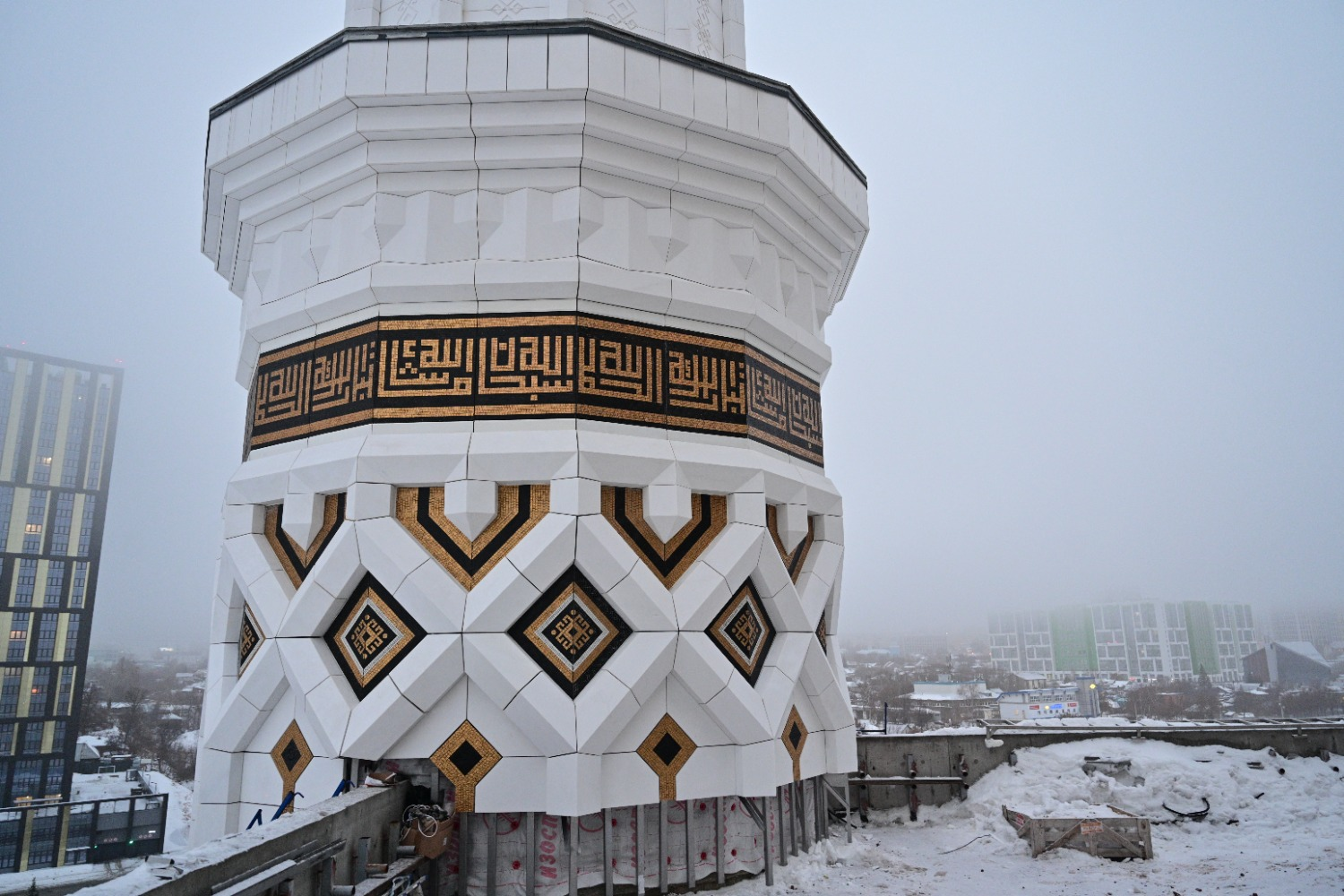 Строители рассказали, что на сегодняшний день они закончили работу по всем четырем минаретам мечети, они облицованы мрамором, доставленным из Греции, смонтирована мозаика. До весны они планируют закончить монтаж трех уровней кровли, потом приступить к декоративному ограждению минаретов и лестниц, которые ведут к ним.