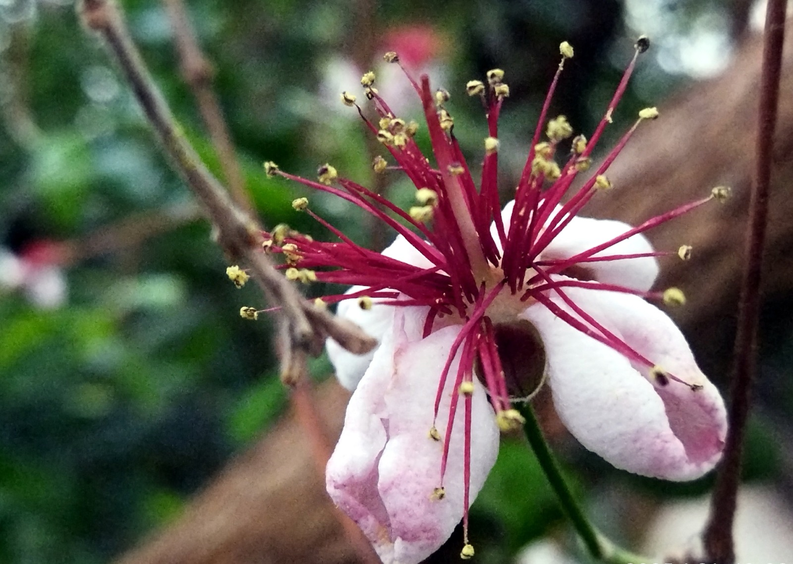 «Фейхоа — это очень красивое растение в период цветения. Именно поэтому его изначально использовали для украшения садов. До сих пор фейхоа используют как декоративное растение в Японии, Алжире и Австралии. В условиях оранжереи цветет дважды в год. Цветы одиночные или в соцветиях от темно-розового до красного с мясистыми лепестками и красивыми длинными пурпурными тычинками. На родине цветки опыляются птицами (колибри), в местах культивирования — пчелами и другими насекомыми. Лепестки цветов съедобны и имеют сладковатый медовый вкус», — пояснили в ботаническом саду.