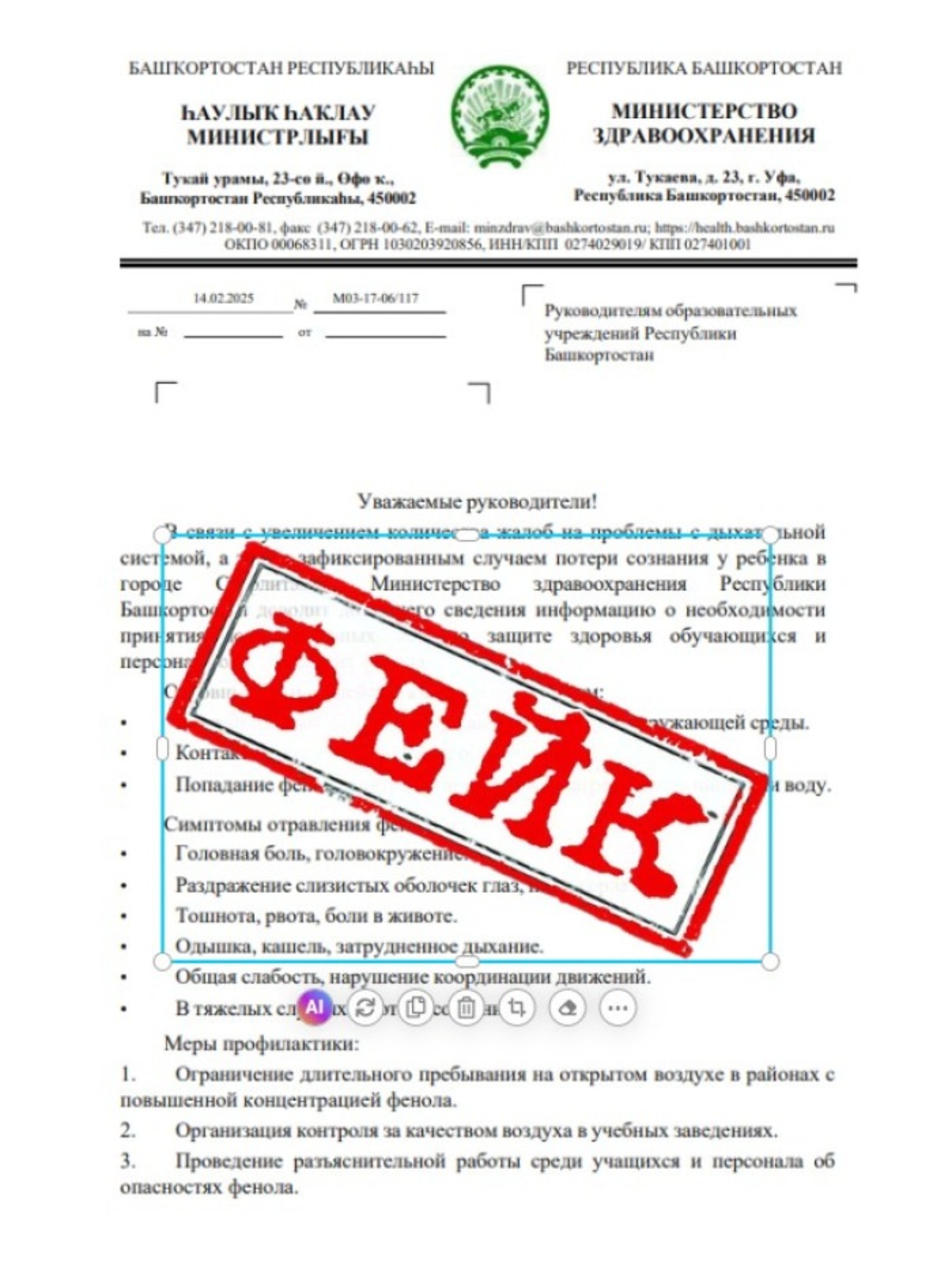 Минздрав Башкирии сообщил о фейковых письмах о феноле. Как сообщили в пресс-службе ведомства, министерство не направляло письма об усилении мер по защите здоровья от воздействия фенола. Дело в том, что в соцсетях распространили документ, в котором говорится о необходимости принятия дополнительных мер для защиты здоровья обучающихся и персонала от воздействия фенола.
