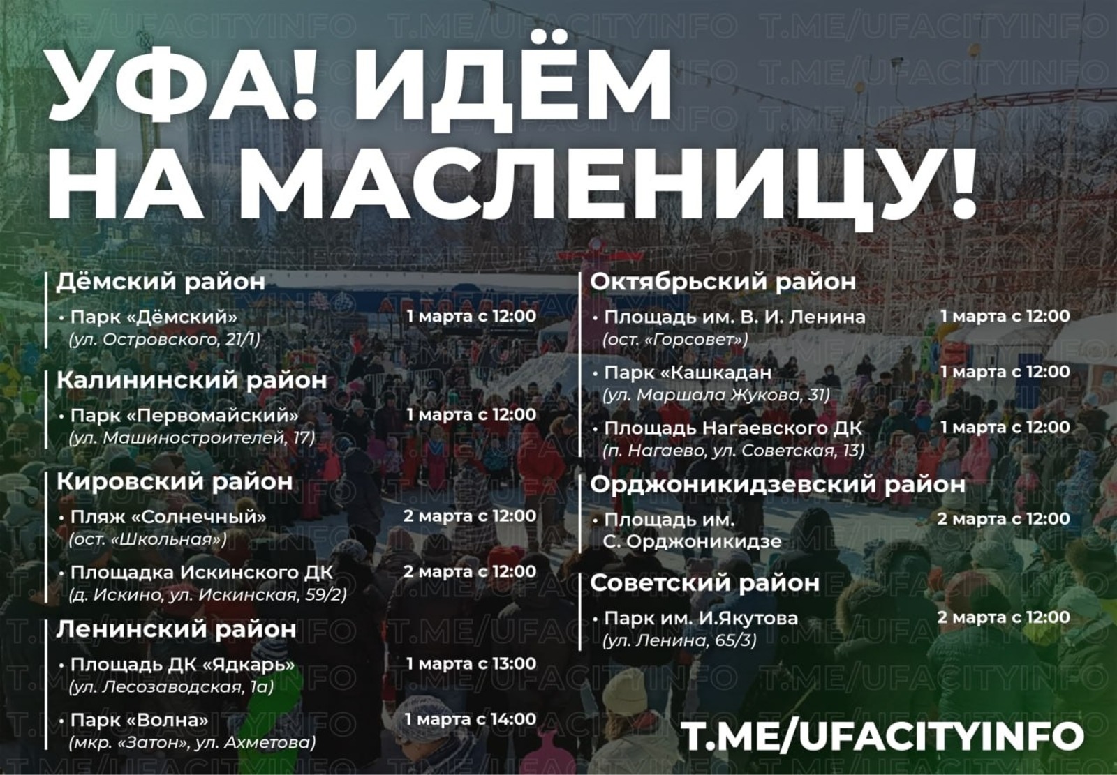 Также 1 марта гуляния пройдут в Дёмском парке, парке «Первомайский», «Кашкадан», на площади перед Нагаевским ДК, в парке «Волна», на площади перед ДК «Ядкарь».