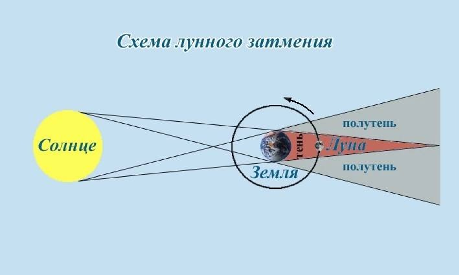 Лунные затмения происходят во время полнолуний, когда Солнце, Земля и Луна выстраиваются на одной прямой и Луна, двигаясь по орбите, попадает в тень, отбрасываемую Землёй. При полном лунном затмении вся Луна попадает в тень Земли. Когда Луна находится в земной тени, она приобретает красно-оранжевую окраску. Из-за этого иногда Луну во время затмения называют кровавой. Во время частного лунного затмения только часть Луны входит в земную тень.