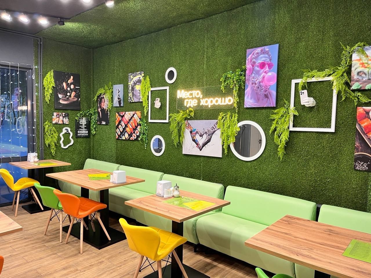 В новом кафе посетителям предлагают широкий ассортимент блюд: бургеры, шаурму, пиццу, блюда японской кухни, разнообразные напитки. Заведение отличается ярким, запоминающимся интерьером. Здесь удобная мебель и оригинальная посуда. Дизайн профессионально разработан супругой бизнесмена, Аленой. Для работников кафе тоже созданы комфортные условия. Предприниматель высоко ценит свою команду.