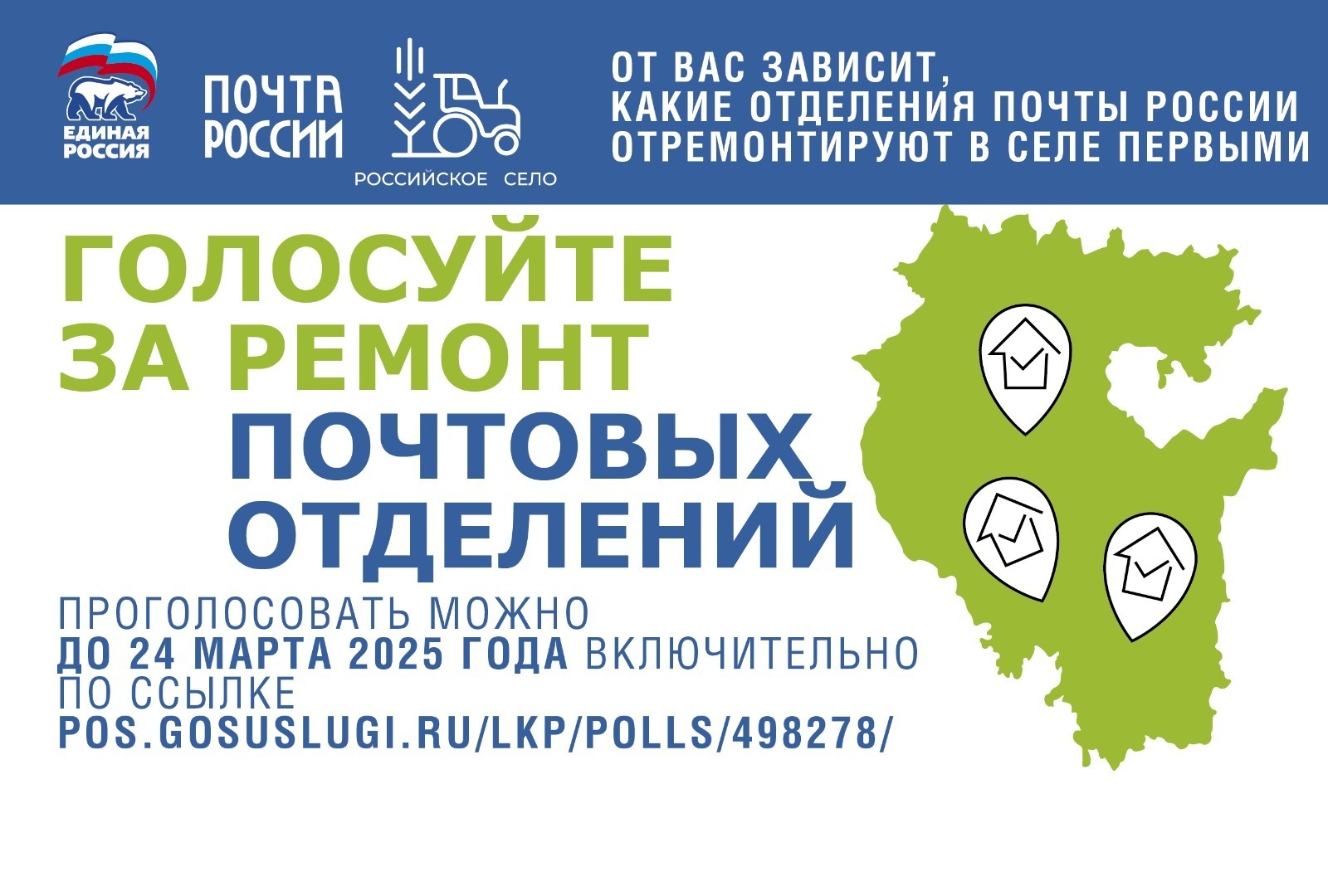 Онлайн-голосование за почтовые отделения, в которых будет проводиться капитальный ремонт до 2030 года, проводится на Госуслугах до 24 марта 2025 года. Проголосовать можно только 1 раз и только за 1 почтовое отделение, расположенное по месту жительства.