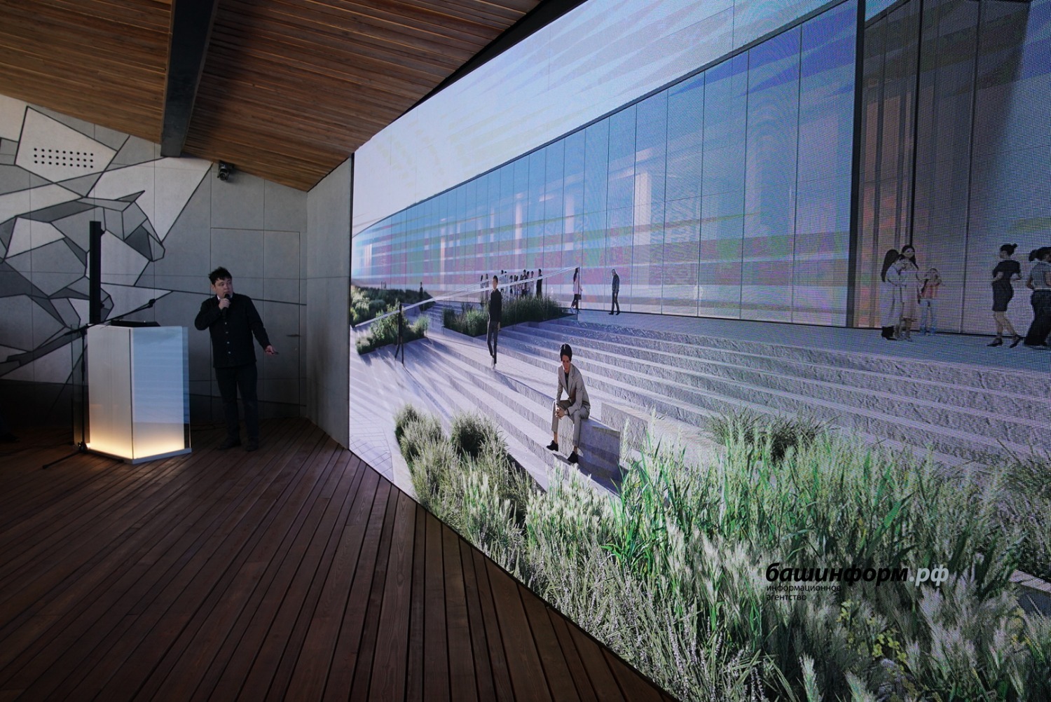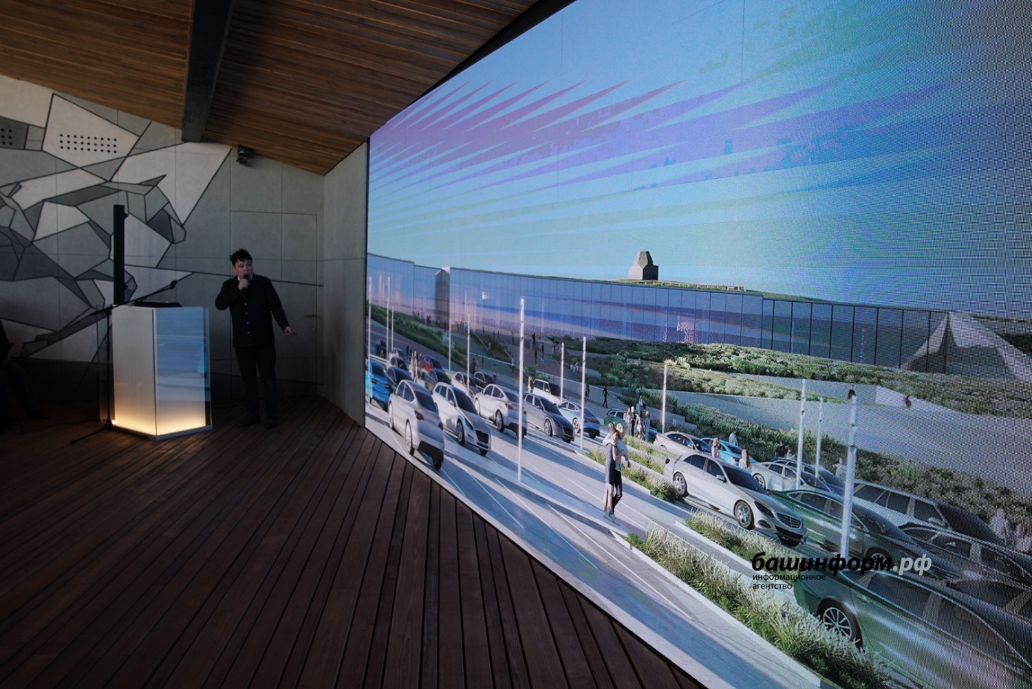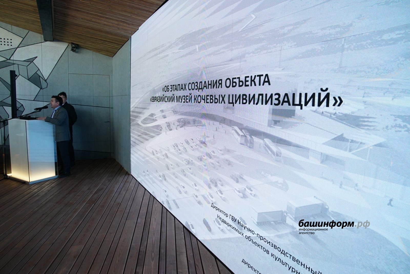 «Здание Евразийского музея кочевых цивилизаций получило приземленный силуэт, органично вписанный в существующий ландшафт. Плавные формы музея не спорят с окружающей средой. Объемы музея интегрированы в существующий рельеф. Здание музея делится на два разноуровневых объема. Первый объем – стилобатная часть. Второй объем – основное здание музея», – доложил на совещании генеральный директор экспертно-проектного бюро «Архтамга» Рустам Алибаев.
