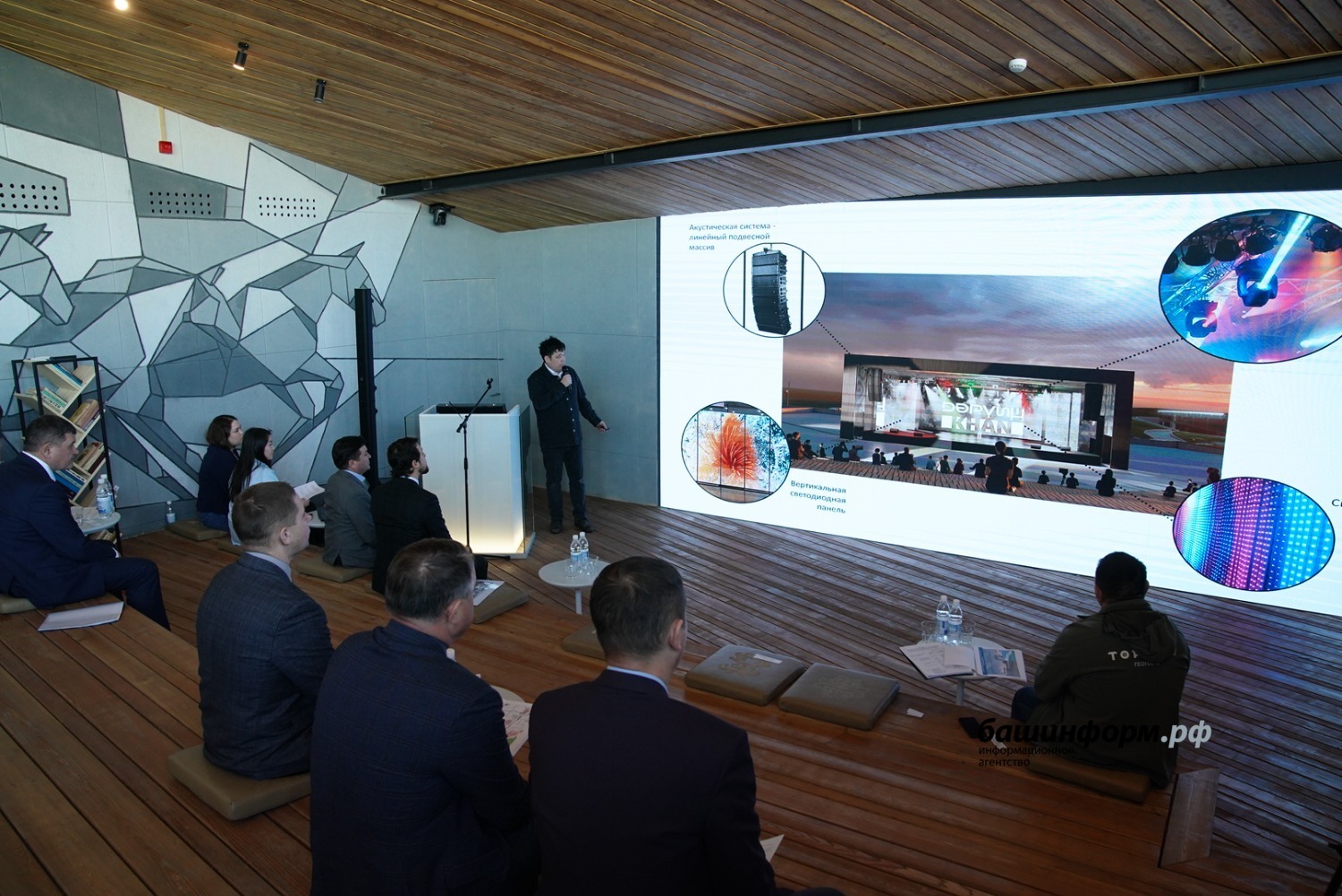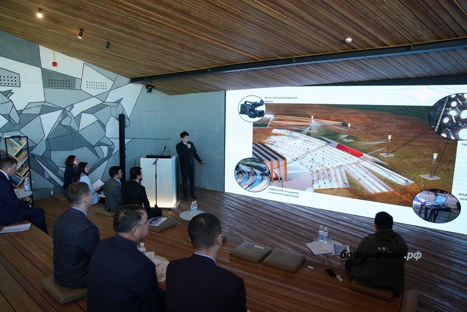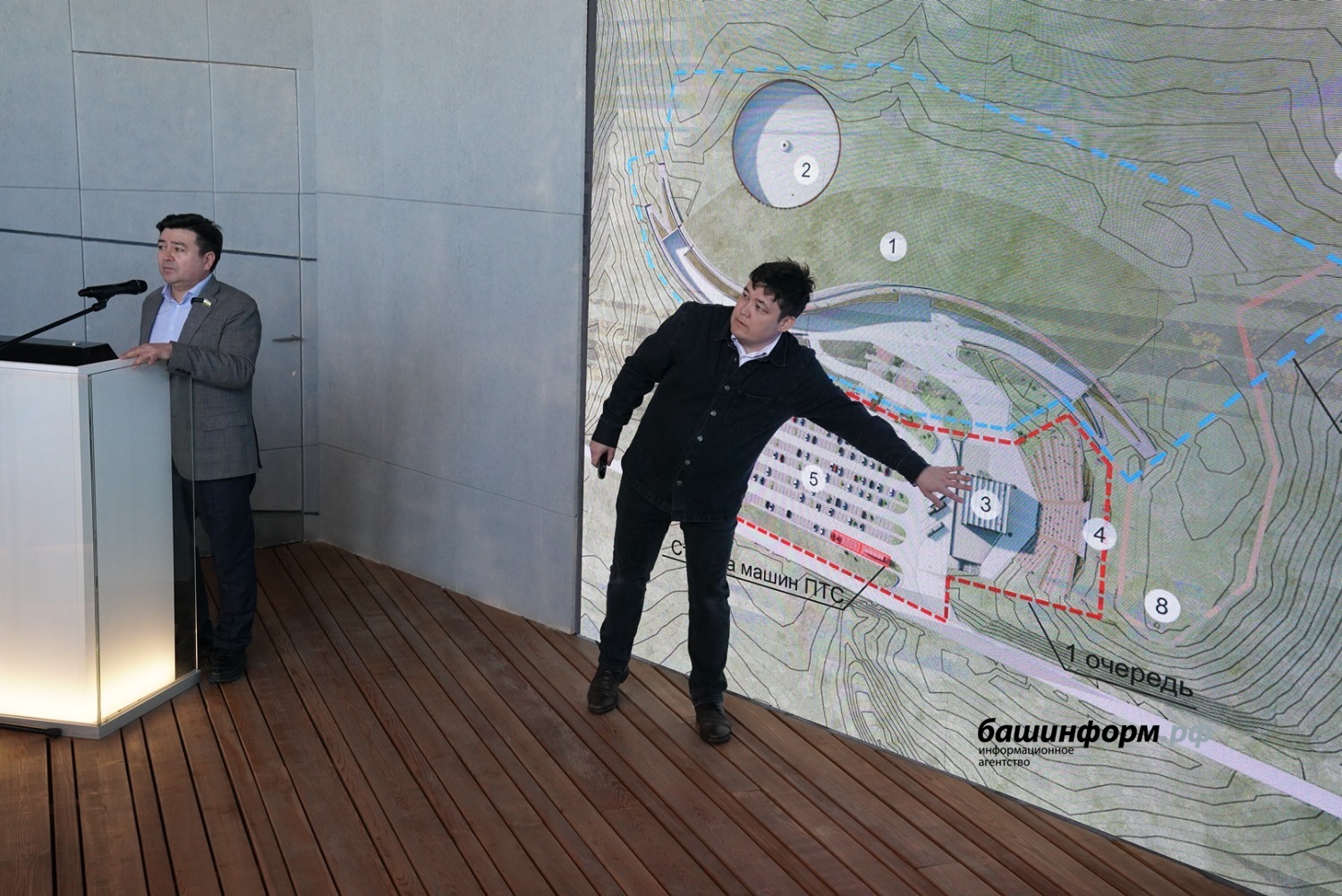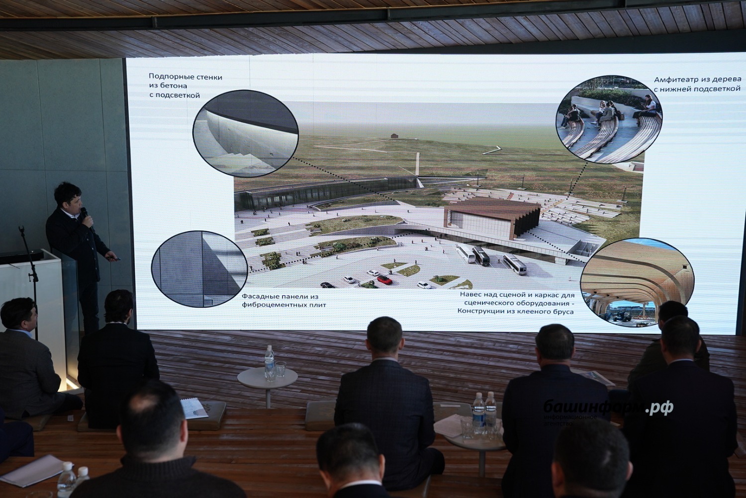 «Здание Евразийского музея кочевых цивилизаций получило приземленный силуэт, органично вписанный в существующий ландшафт. Плавные формы музея не спорят с окружающей средой. Объемы музея интегрированы в существующий рельеф. Здание музея делится на два разноуровневых объема. Первый объем – стилобатная часть. Второй объем – основное здание музея», – доложил на совещании генеральный директор экспертно-проектного бюро «Архтамга» Рустам Алибаев.