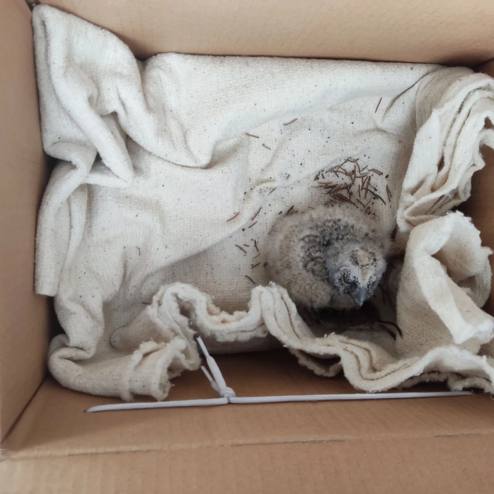 «Так как возможности вернуть на дерево, на ветку не было (ветки узкие), из коробки, верёвки и настила организовали импровизированное гнездо на возвышенности, несколькими метрами ниже основного гнезда. Туда и помещён совёнок вместе с едой. Завтра-послезавтра проедем понаблюдаем. Если с ним будет всё хорошо и мать его не заберёт, то на лестнице поднимем его до основного гнезда», — сообщили в «Пин и Пуф».