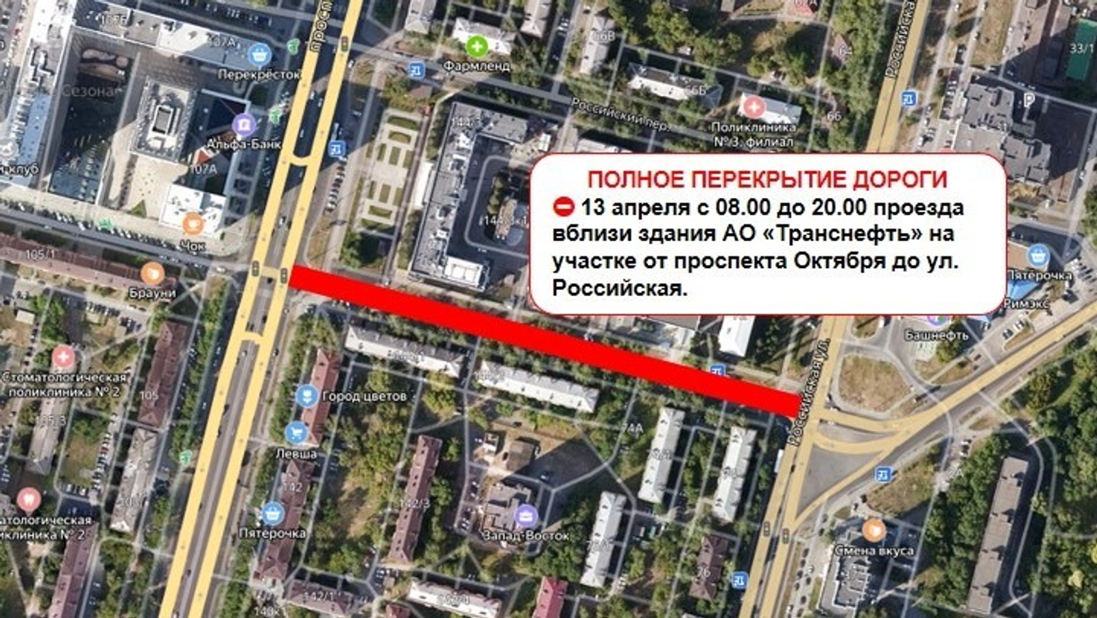 В Уфе 13 апреля с 8 до 20 часов закроют проезд у НИИ «Транснефть» (пр. Октября, 144/3). Речь идет об участке от проспекта Октября до улицы Российской.