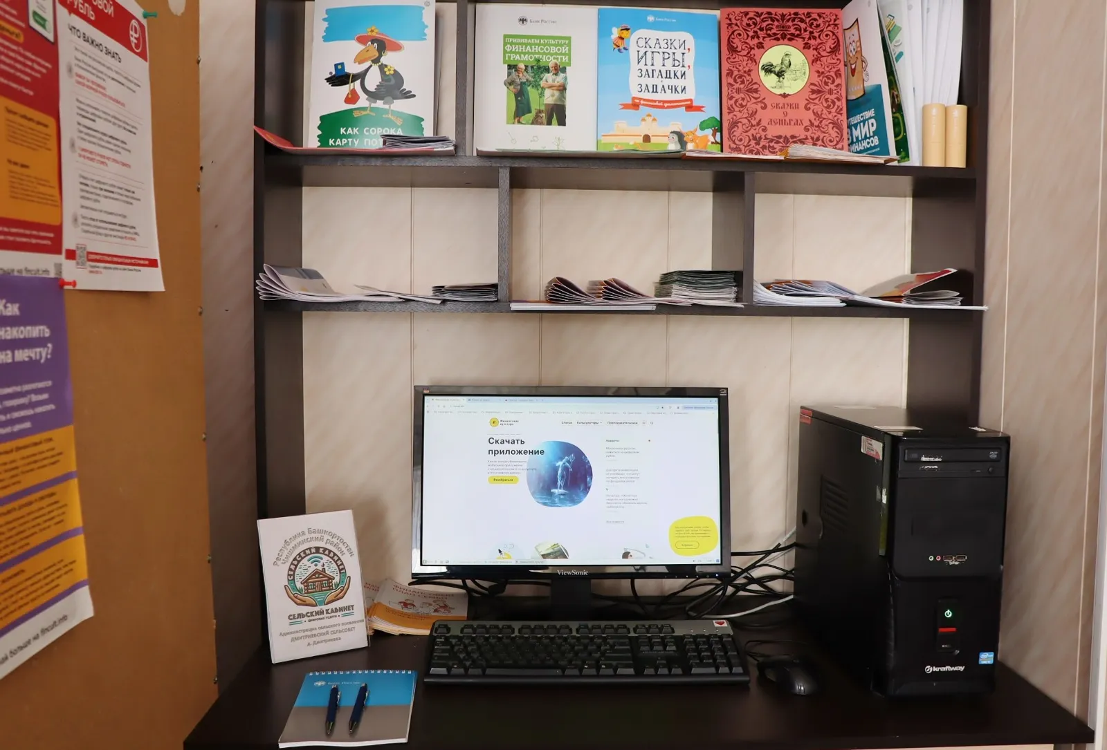 В администрации и библиотеке деревни Дмитриевка Чишминского района появились уголки финансовой грамотности. Отдельный компьютер с интернетом выделен для того, чтобы местные жители могли воспользоваться различными услугами: оплатить налоги, коммунальные счета, отправить перевод, открыть вклад, оформить страховку, получить кредит, записаться в МФЦ или на приём к врачу, приобрести билеты, и другое.