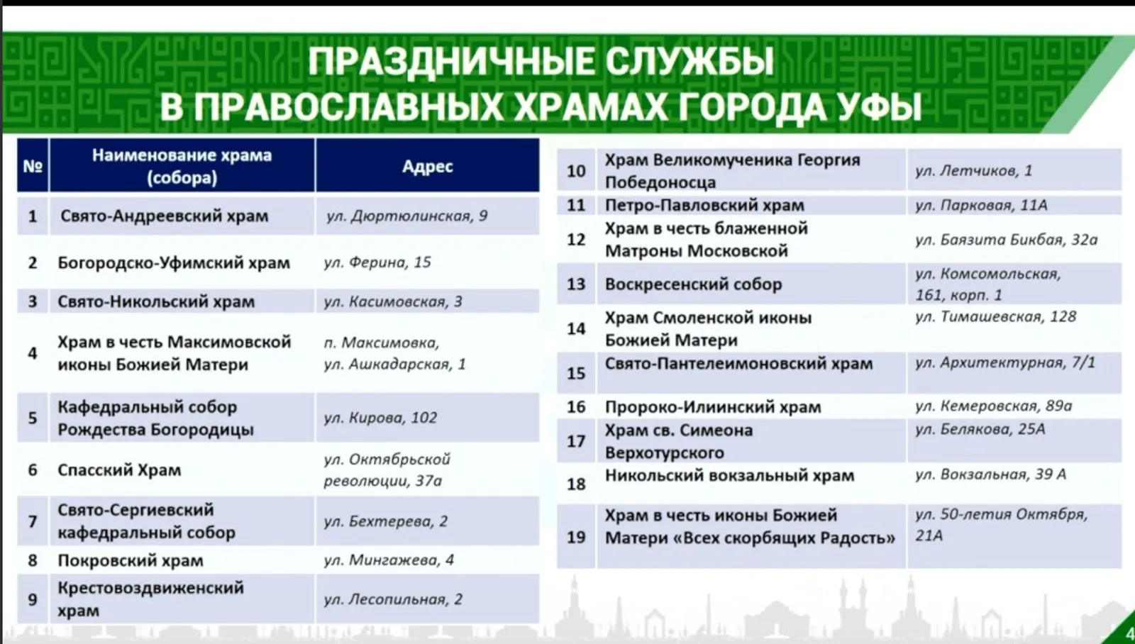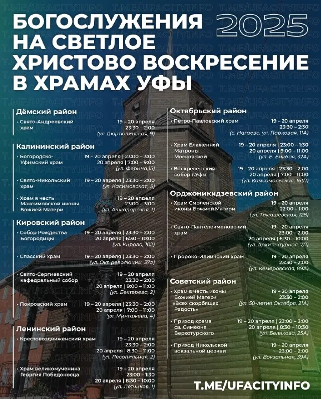 На оперативном совещании мэрии Уфы сообщили график пасхальных богослужений и предупредили о перекрытиях дорог. 20 апреля православный мир отметит главный христианский праздник — Светлую Пасху. Праздничные богослужения пройдут в 19 храмах Уфы.