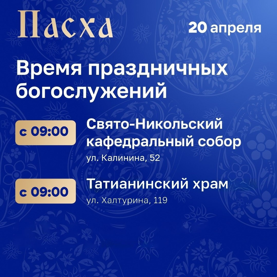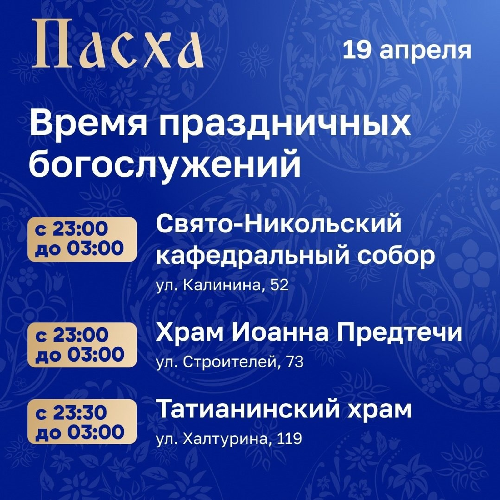 Так, 19 апреля, в 23 часа богослужения начнутся в Свято-Никольском кафедральном соборе, в храме Иоанна Предтечи, в Татианинском храме.