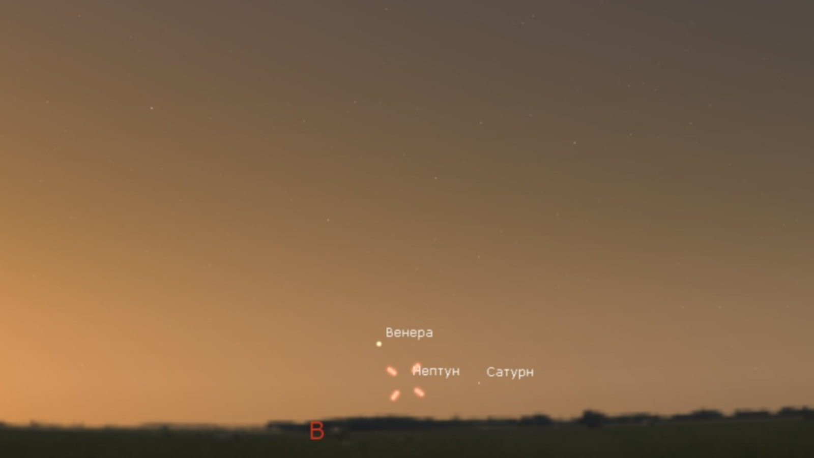 Только Венера как яркая звезда будет видна на фоне зари, Нептун будет находиться немного правее и ниже Венеры, но не будет виден.