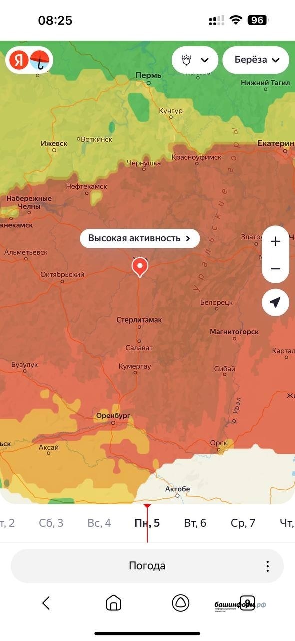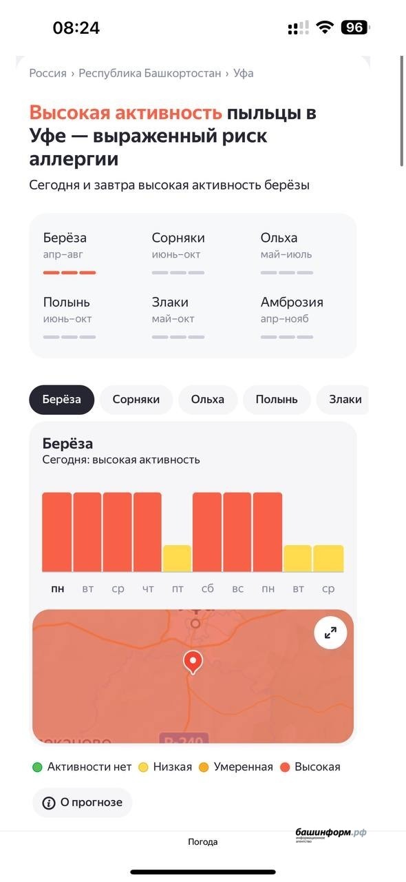 По данным Яндекс сервисов, высокая активность пыльцы ожидается по всей Башкирии сегодня и ближайшие дни из-за цветения берез.