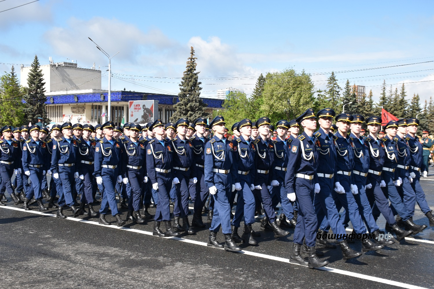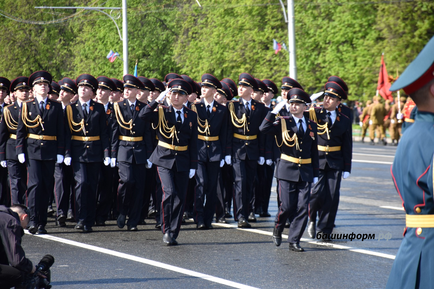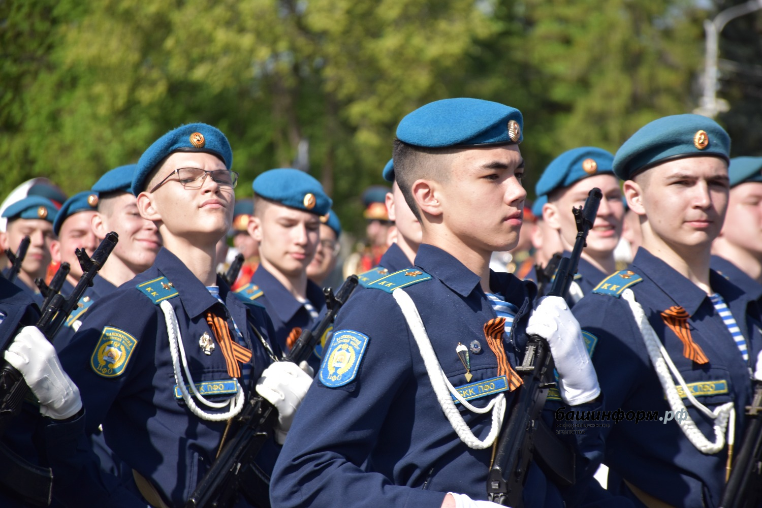 Сегодня он шёл во главе группы воспитанников кадетской школы-лицея села Булгаково Уфимского района и открыл парадный расчёт Всероссийского военно-патриотического движения «Юнармия».