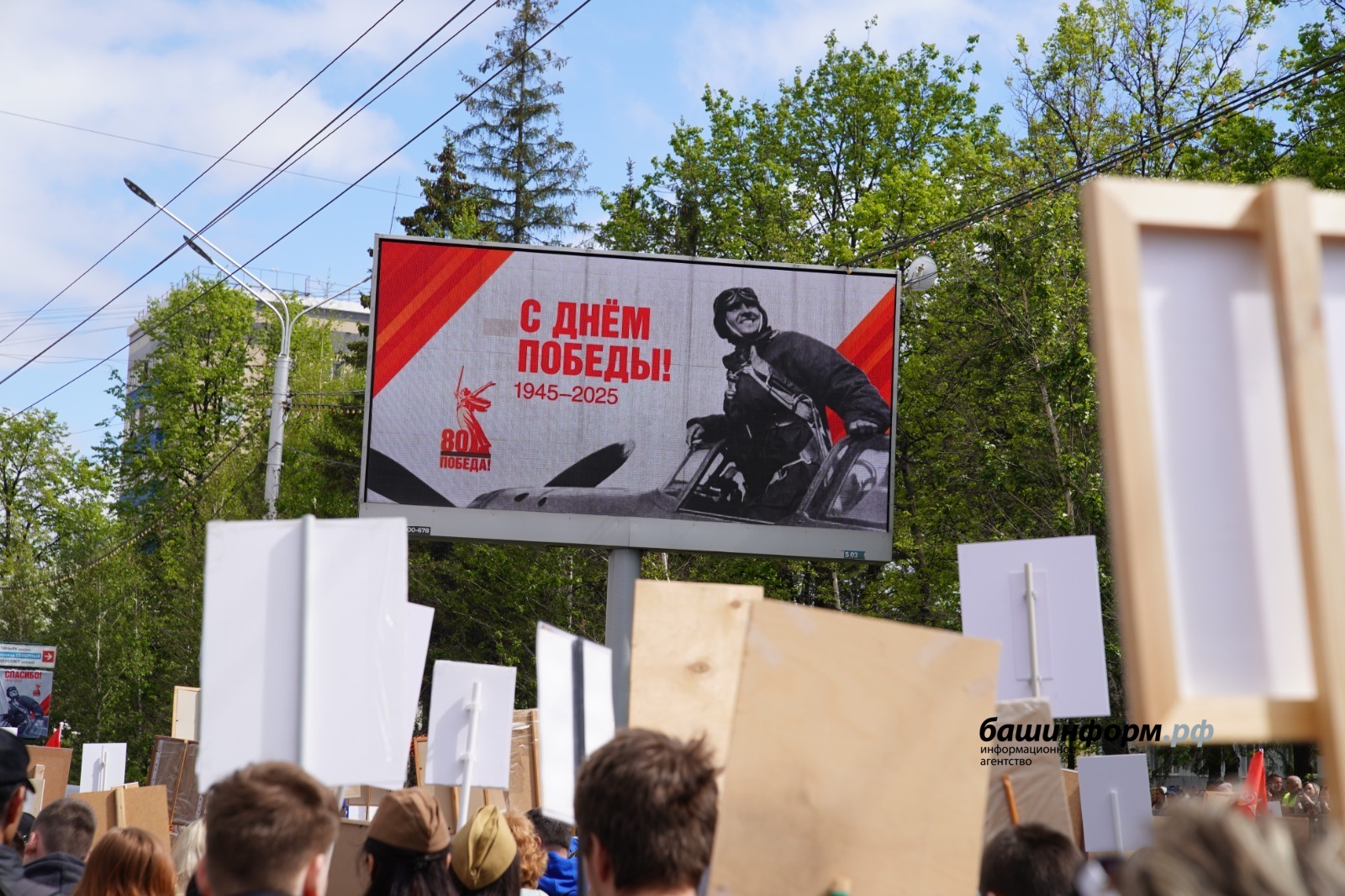 Кроме того, стела «Уфа – Город трудовой доблести» преобразилась благодаря мощным зенитным прожекторам, освещающим небо. На трассе Уфа – Аэропорт на динамических табло размещены открытки, посвящённые Победе.