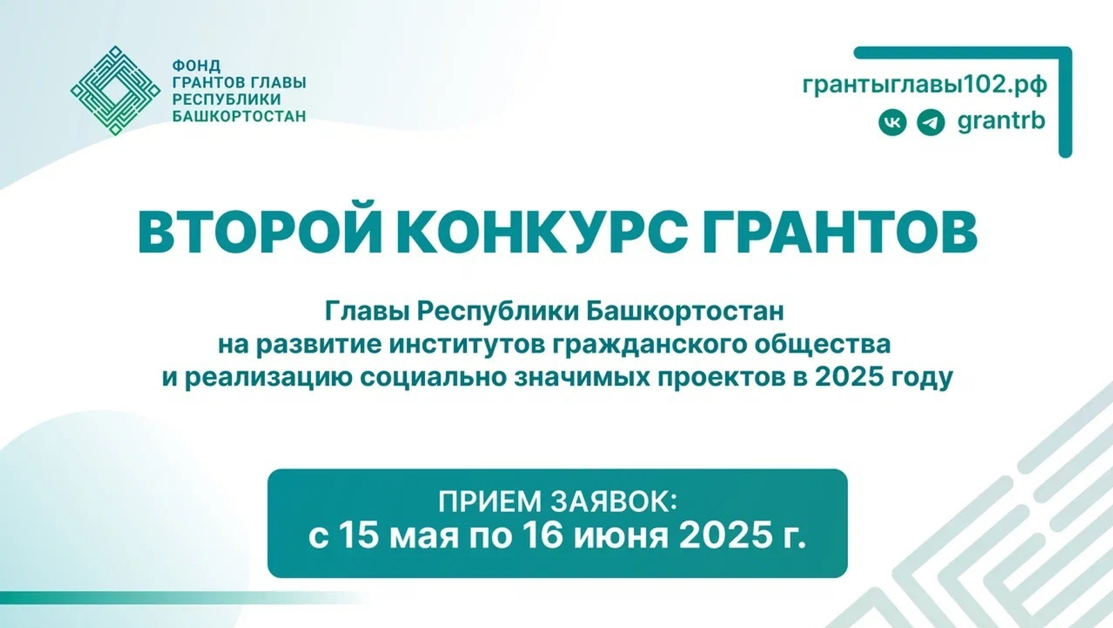 Дата начала приема заявок — 15 мая 2025 года. Фонд завершает прием заявок на участие в конкурсе 16 июня 2025 года в 17.00 по местному времени. Заявки принимаются на сайте грантыглавы102.рф, на котором в разделе «Документы» также можно ознакомиться с положением конкурса и подробной информацией о требованиях к участникам конкурса, условиях и порядке предоставления грантов.