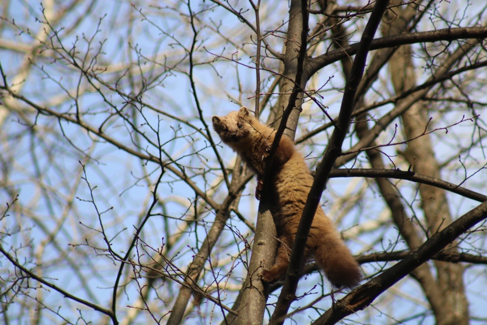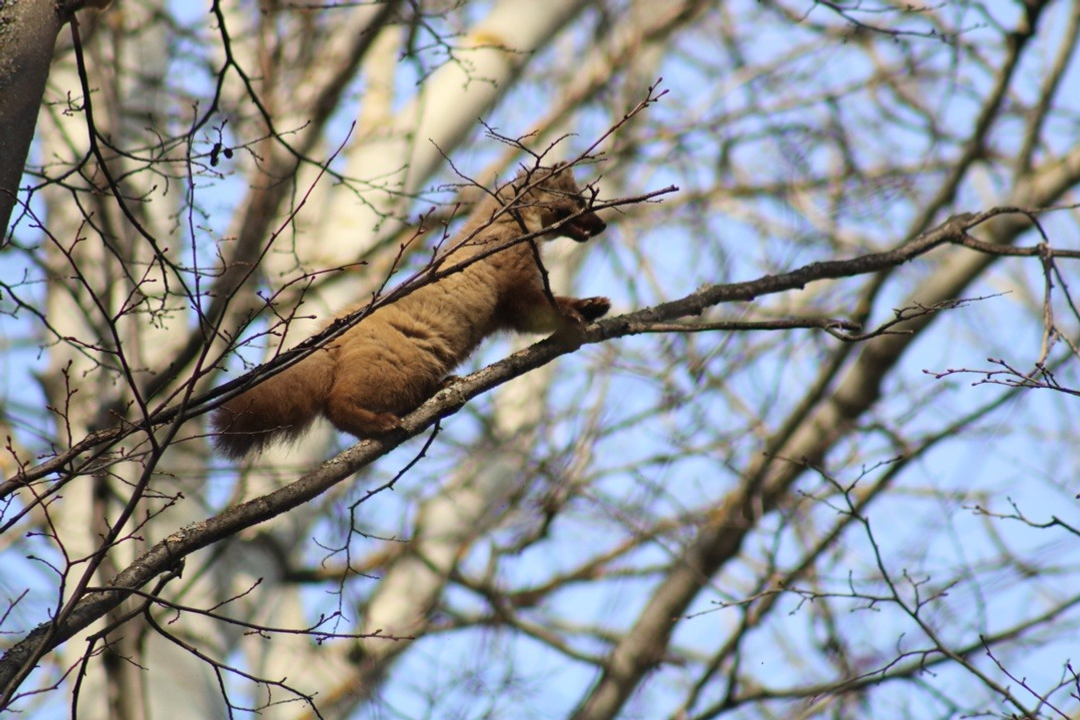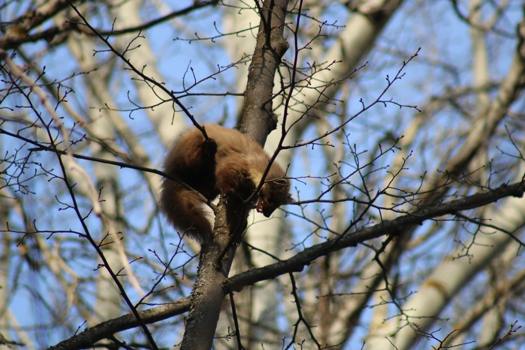 В национальном парке «Башкирия» смогли запечатлеть куницу на дереве, которая пряталась от собак.