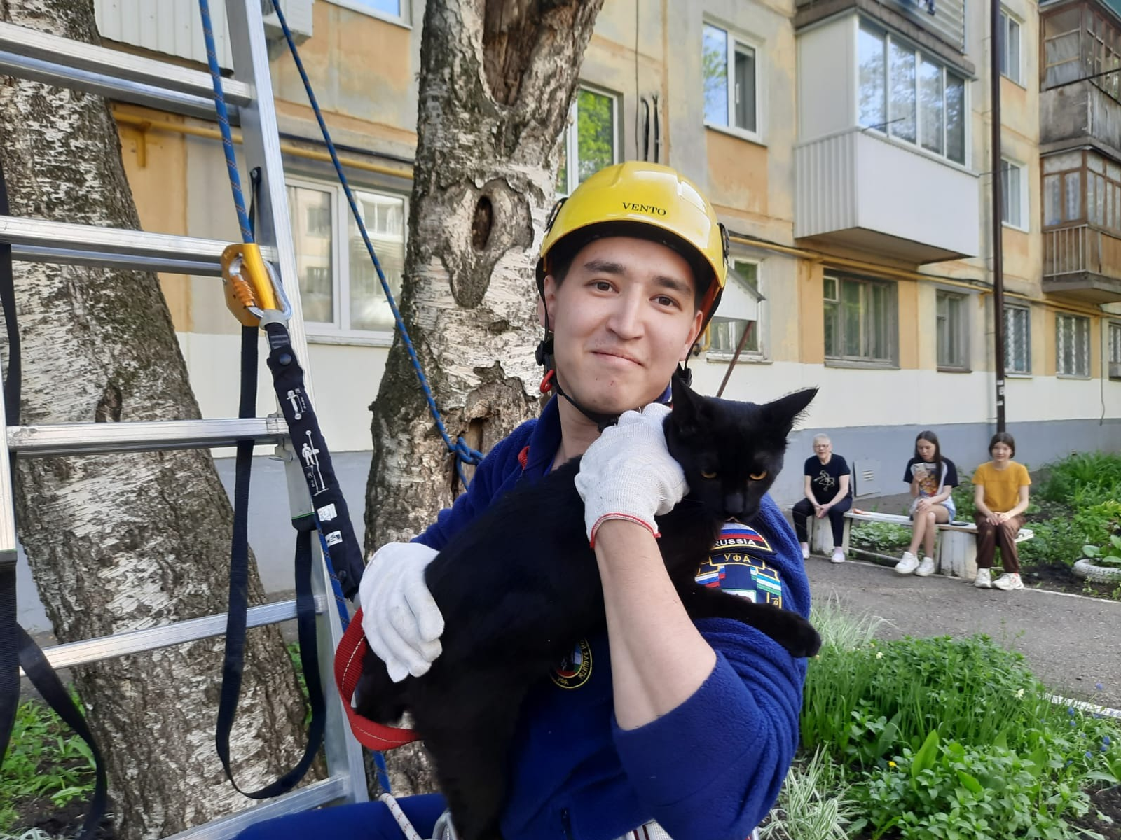 Сотрудники поисково-спасательного отряда при помощи лестницы и альпинистского снаряжения сняли перепуганную кошку с дерева и передали хозяйке.