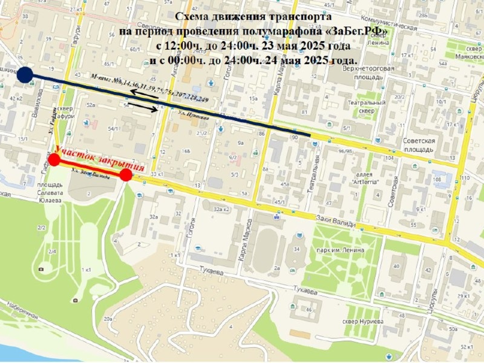 На время перекрытия не будут курсировать трамваи №№ 5, 16. Троллейбусный маршрут № 22 будет работать по измененной схеме движения: в сторону центра – Колхозный рынок, пр. Октября, ул. Шафиева, ул. Р. Зорге, бульвар Ибрагимова, ул. Пархоменко, ТК «Центральный». В обратную сторону: по ул. 50-летия Октября, пр. Октября, Колхозный рынок. Схема движения автобусных маршрутов также прилагается.