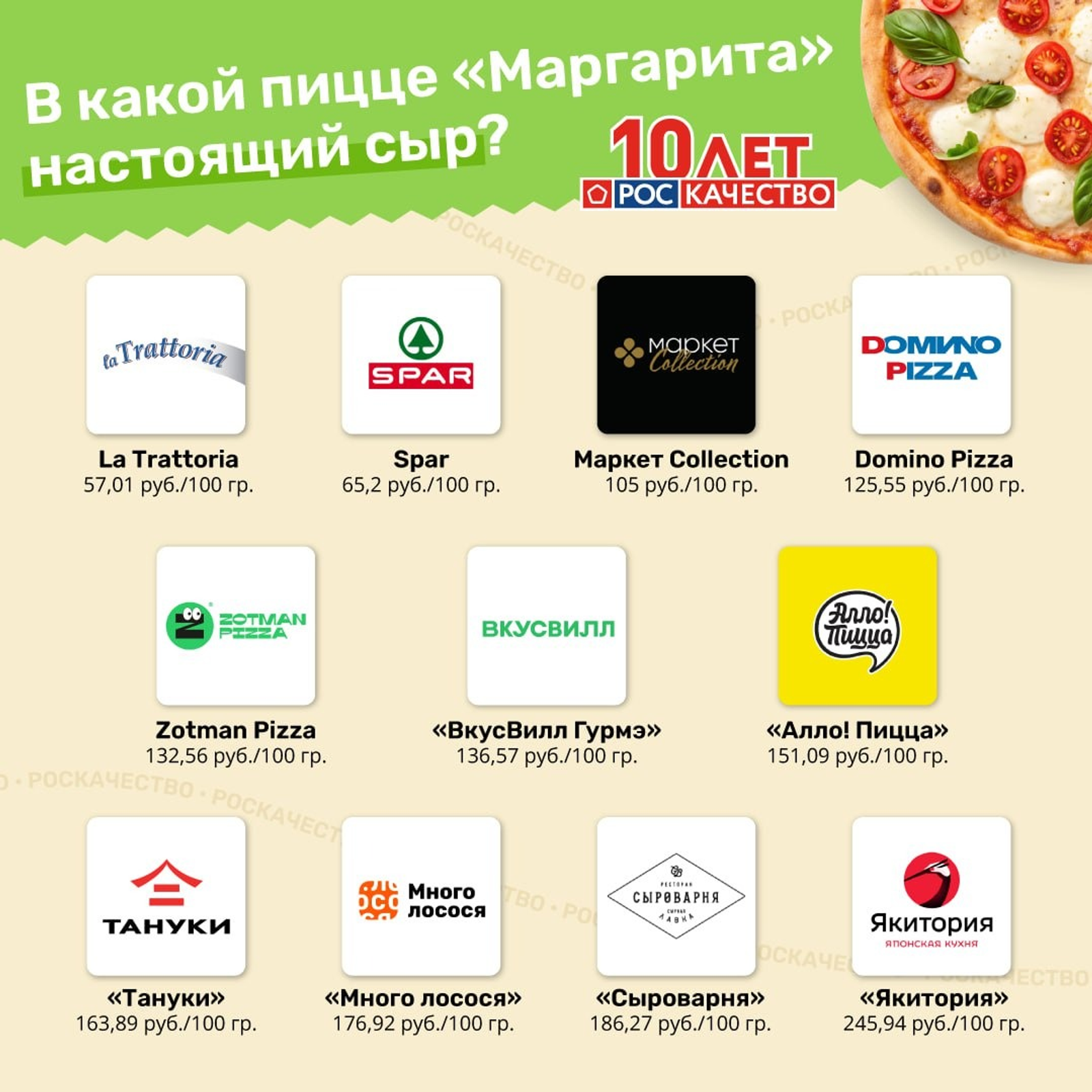 Ожидаемо высоким качеством обладают самые дорогие пиццы (более 150 руб. за 100 г). Но также эксперты считают, что La Trattoria и Spar, «Маркет Collection» и Domino Pizza — показали высокое качество по доступной цене.