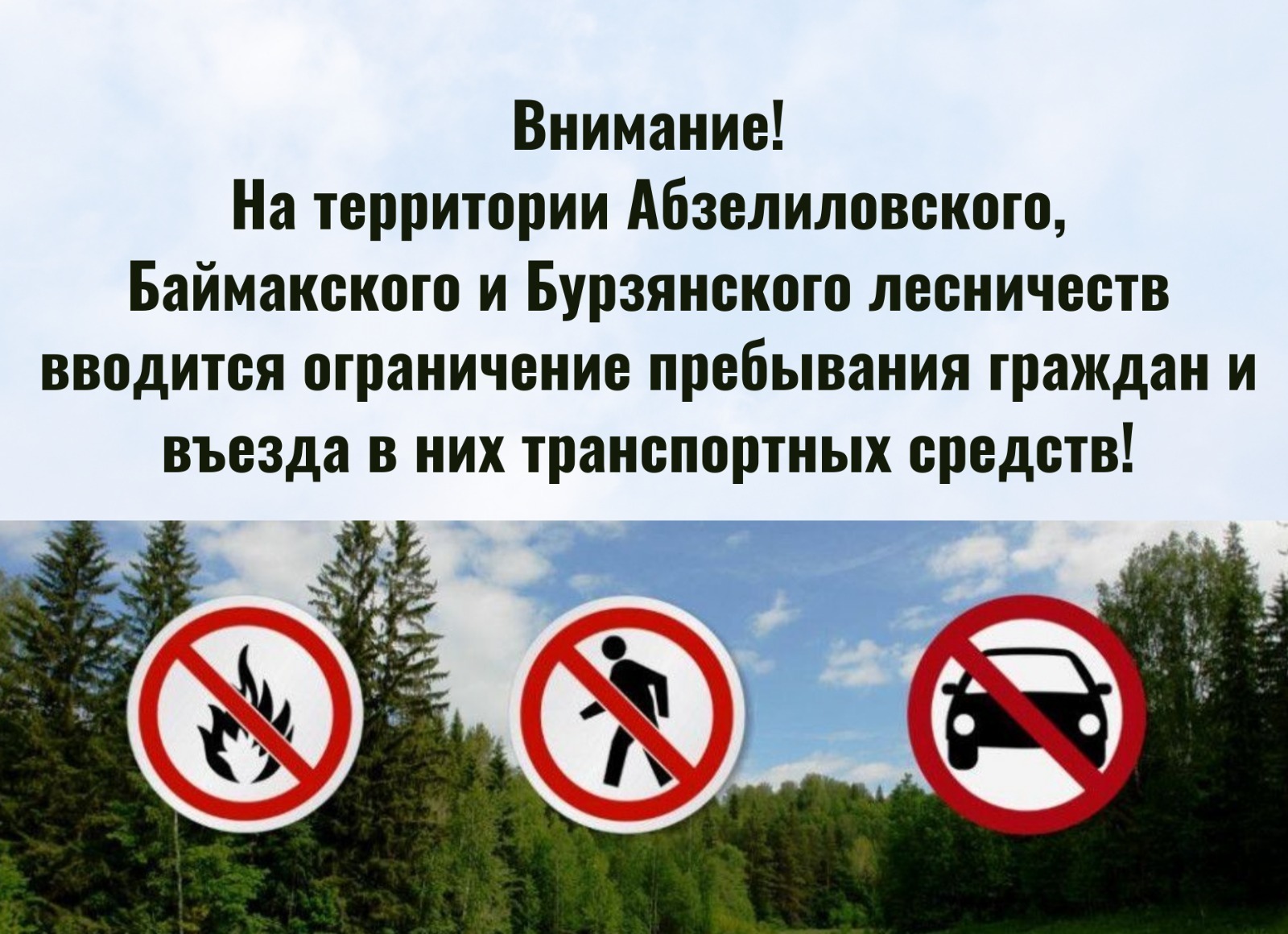 На территории Абзелиловского, Баймакского и Бурзянского лесничеств с 26 мая по 15 июня ограничат пребывание граждан (туристов и охотников) и въезд транспорта. Это связано с повышением пожароопасности в лесах, сообщила «Башинформу» пресс-секретарь минлесхоза Башкирии Наиля Зарипова.