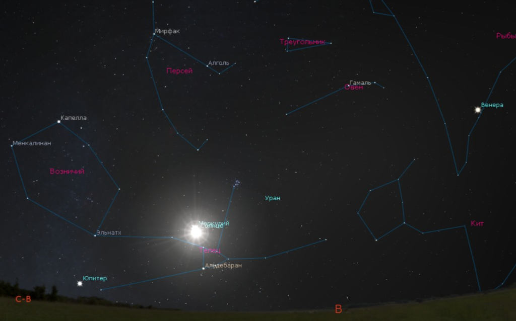 В 20-х же числах июня он станет заходить на 1,5 часа позже Солнца и обозначится у самого горизонта на северо-западе, на фоне угасающей зари, как яркая звездочка в созвездии Близнецов.