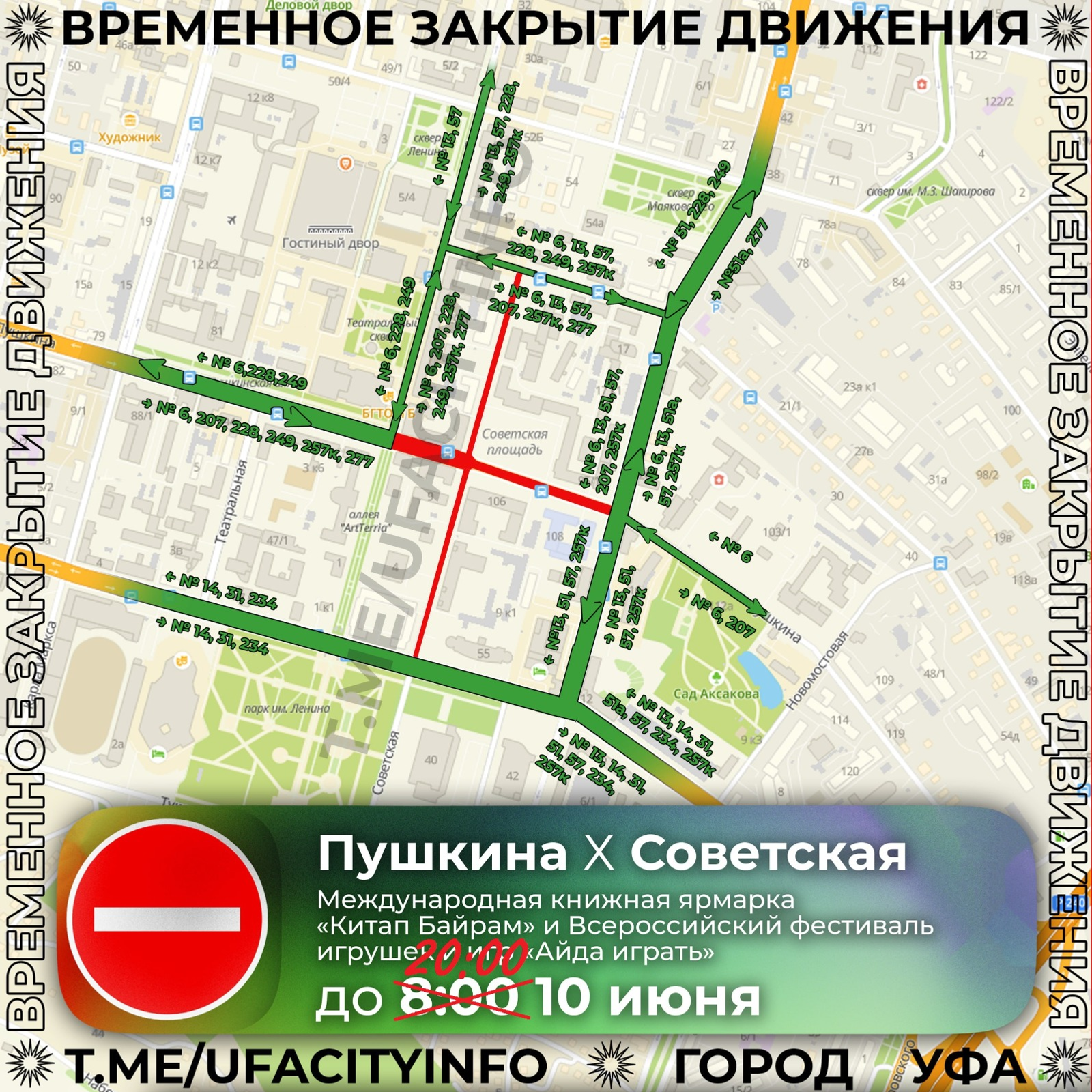 В Уфе перекрытие участков улиц Пушкина (от Цюрупы до Ленина) и Советской (от Заки Валиди до Октябрьской революции) продлили до 20 часов 10 июня.