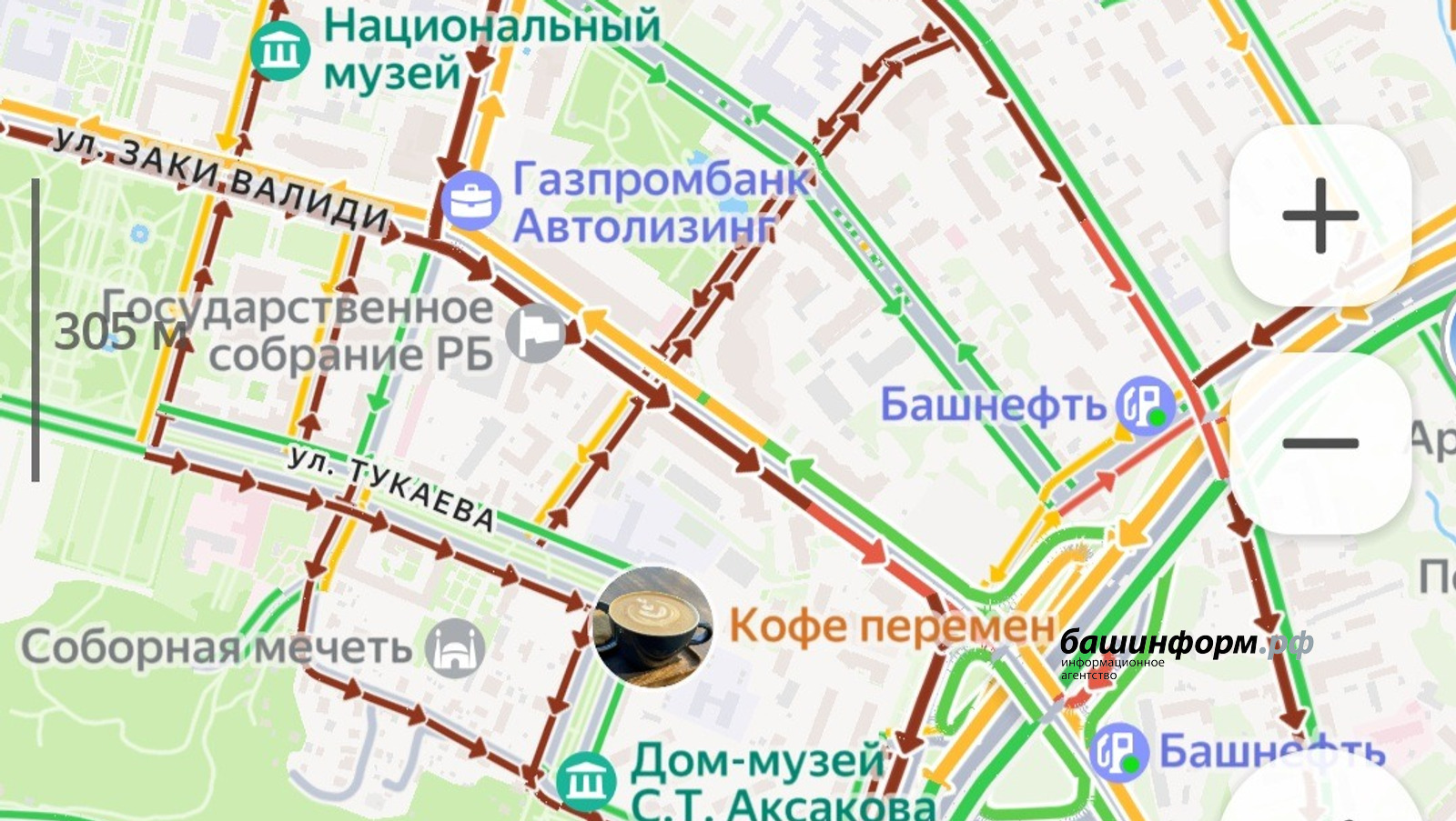 Затруднения движения наблюдаются традиционно на уфимских улицах Заки Валиди, Пушкина, Цюрупы, проспекте Октября, 50 лет СССР и других транспортных артериях Уфы.